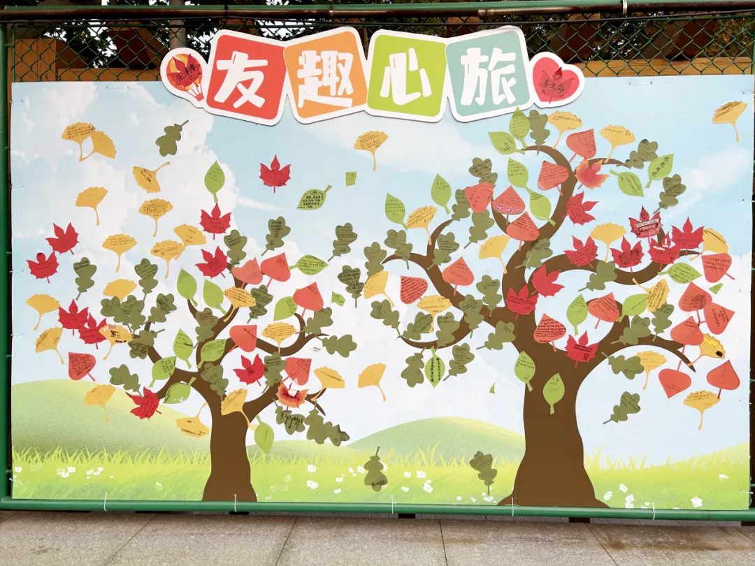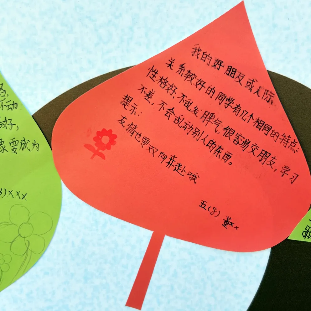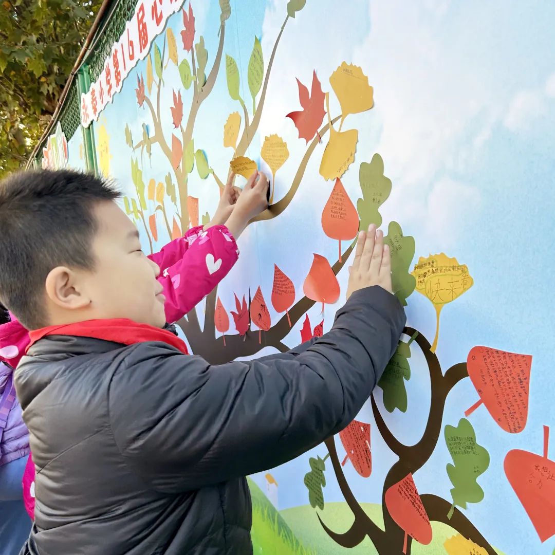 在活动中,老师和学生们纷纷拿起笔,在一片片形状各异、颜色丰富的秋叶上,书写下对伙伴的赞美、美好回忆以及在交往过程中认为最重要和值得注意的事情。这些话语有的真挚感人,有的幽默风趣,每一片叶子都承载着师生们深深的情感与真挚的友谊。当这些秋叶被贴在操场上的大树展板上,形成了一面充满爱与温暖的“心语墙”时,整个校园都弥漫着一种温馨而和谐的氛围。学生们驻足观赏,相互分享,不仅加深了对彼此的了解和信任,还激发了更多的正面情感与积极能量。