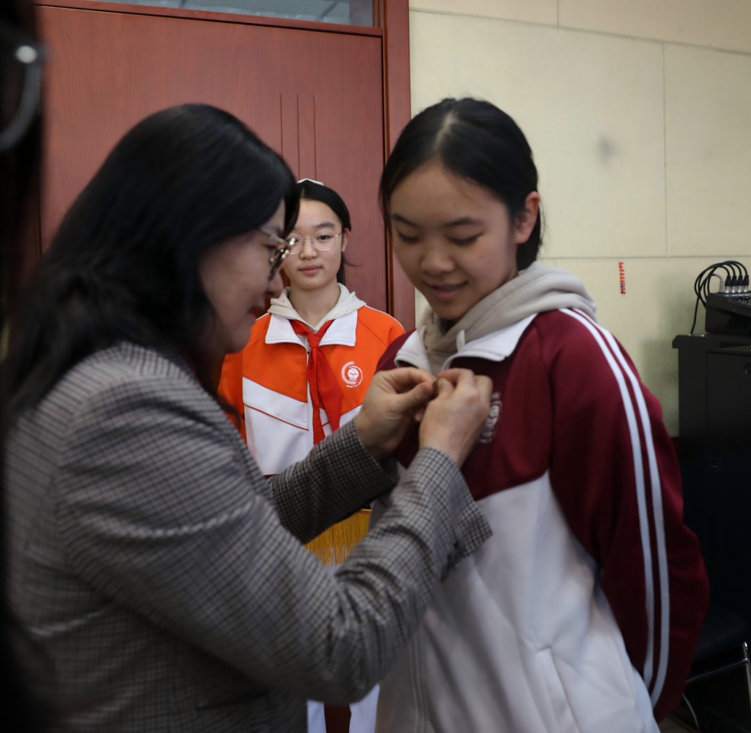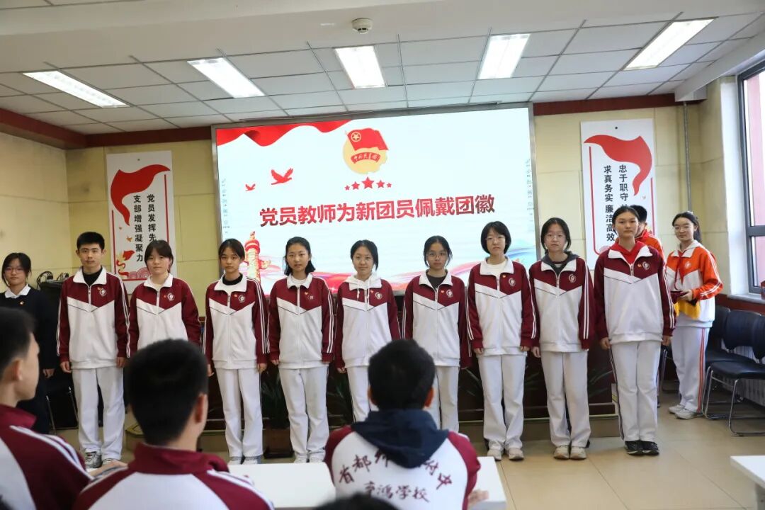 党员教师为新团员佩戴团徽。一枚徽章,一份重量;一次托付,一生信仰。