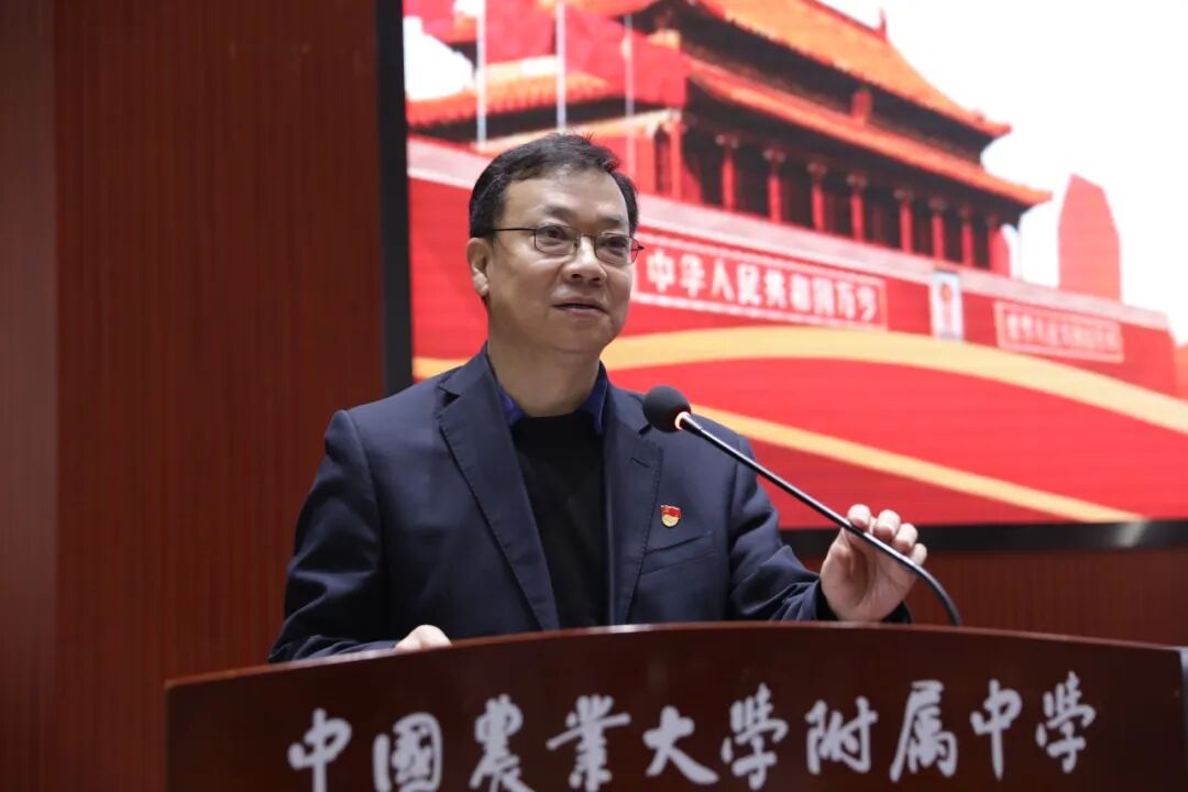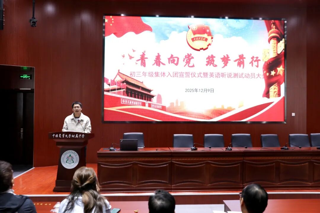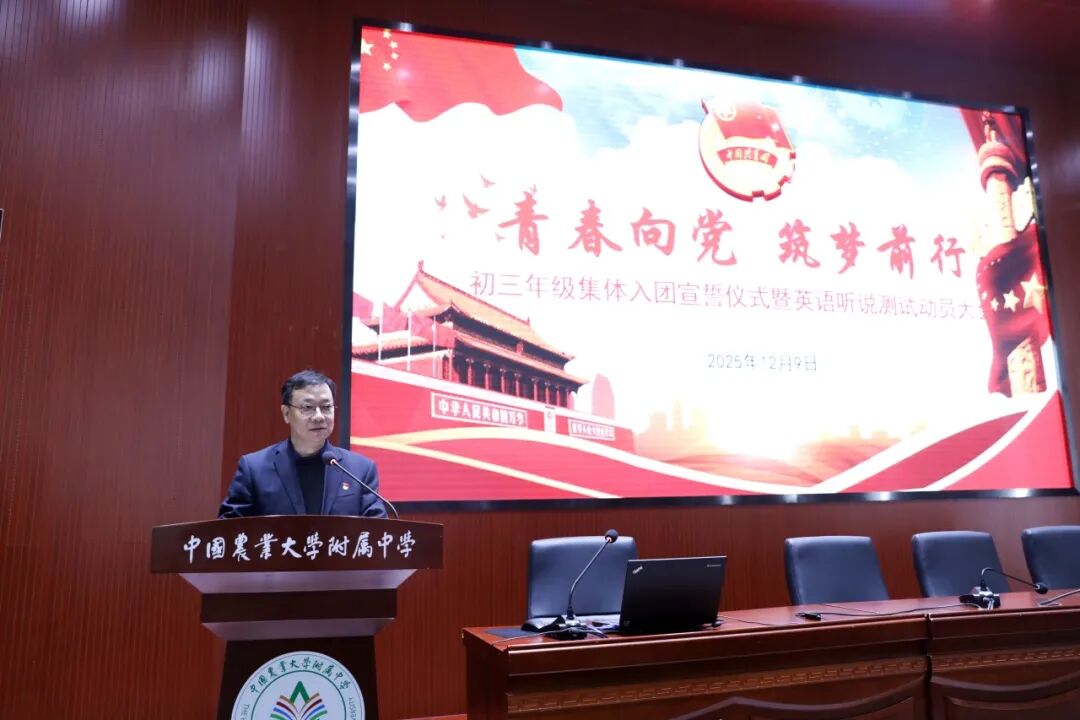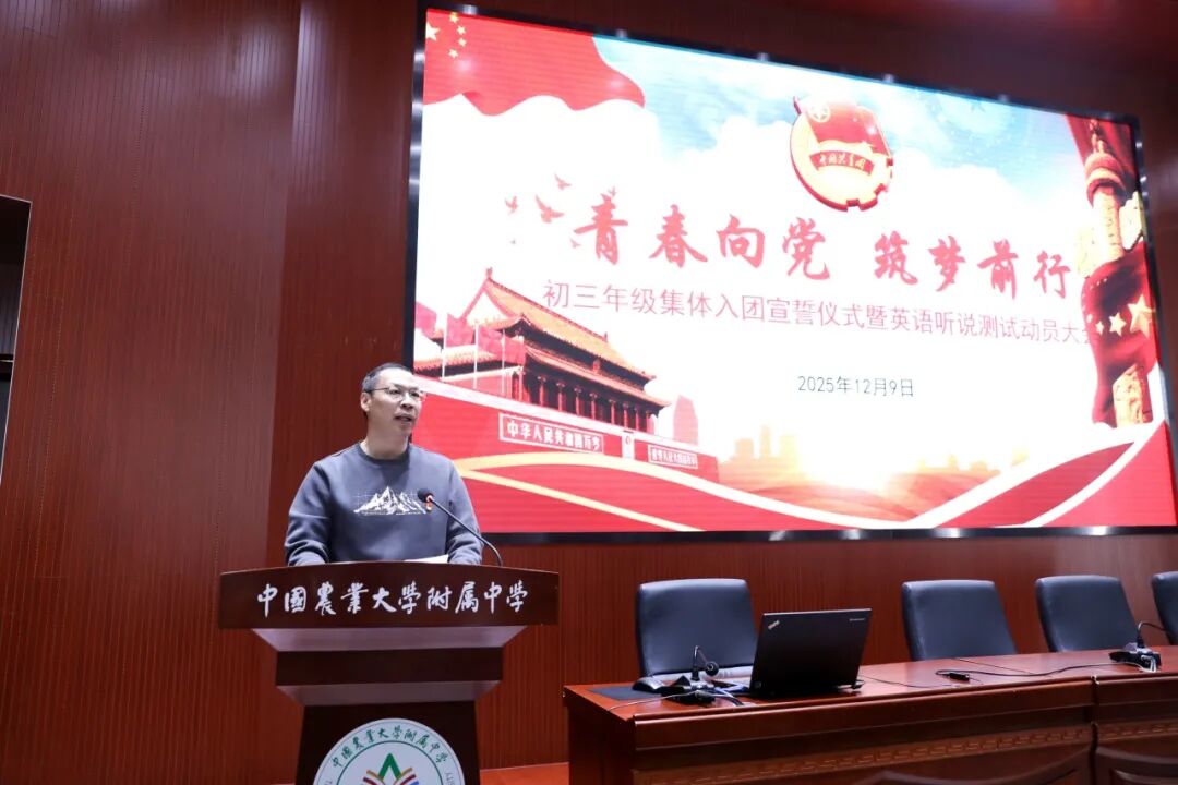 为纪念 “一二・九运动”90 周年,赓续革命先烈的爱国主义精神,让红色基因融入青春血脉,农大附中初三年级全体师生于 12 月 9 日齐聚一堂,隆重举行入团宣誓仪式暨英语听说动员誓师大会 —— 将爱国情怀转化为奋进动力,以青春之姿迎战学考,让特殊的纪念日成为逐梦路上的精神坐标。校党委委员、常务副校长张兴华,校团委书记杨松出席活动,初三年级团总支副书记李诗琦主持本次主题活动。