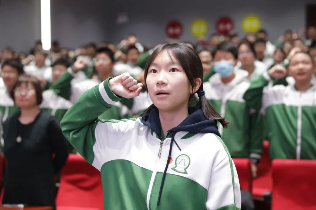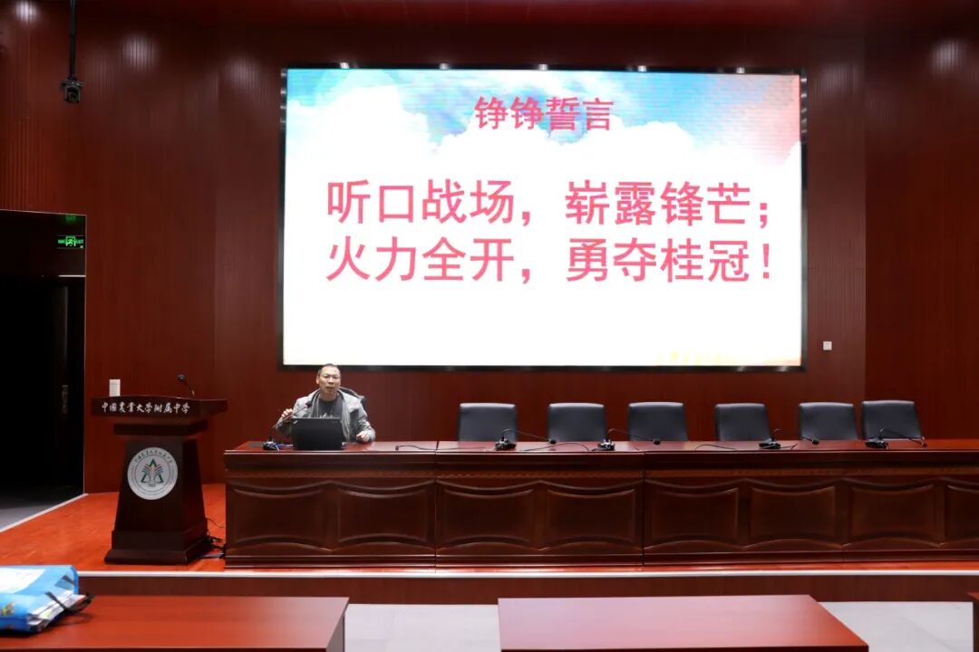 随后,学生会主席李欣冉带领全体学生庄严宣誓:“听口战场,崭露锋芒;火力全开,勇夺桂冠!”誓言响彻整个礼堂,字字铿锵、振奋人心,将备战听口考试的昂扬斗志推向顶点。