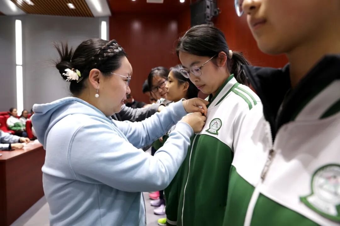 在这个值得全体团员铭记的日子里,初三年级党支部全体党员与班主任老师郑重为新团员佩戴团徽。这枚闪耀的徽章,既是新身份的标识,更承载着组织的信任与沉甸甸的责任。老师们以殷切温暖的目光凝望新团员,目光里饱含着对他们成长的深切关怀,更寄托着对青年一代未来的美好期许。