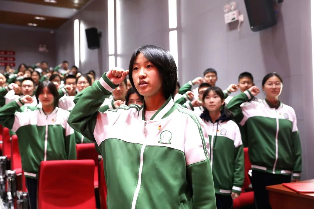 初三年级团总支书记李泓润带领全体新团员高举右拳、庄严宣誓。“我志愿加入中国共产主义青年团……”铿锵有力的誓词响彻礼堂,字字千钧、掷地有声,既彰显着新团员对组织的无限忠诚,更凝聚着他们传承红色基因、勇担青春使命的坚定决心,将仪式的庄重氛围推向高潮。