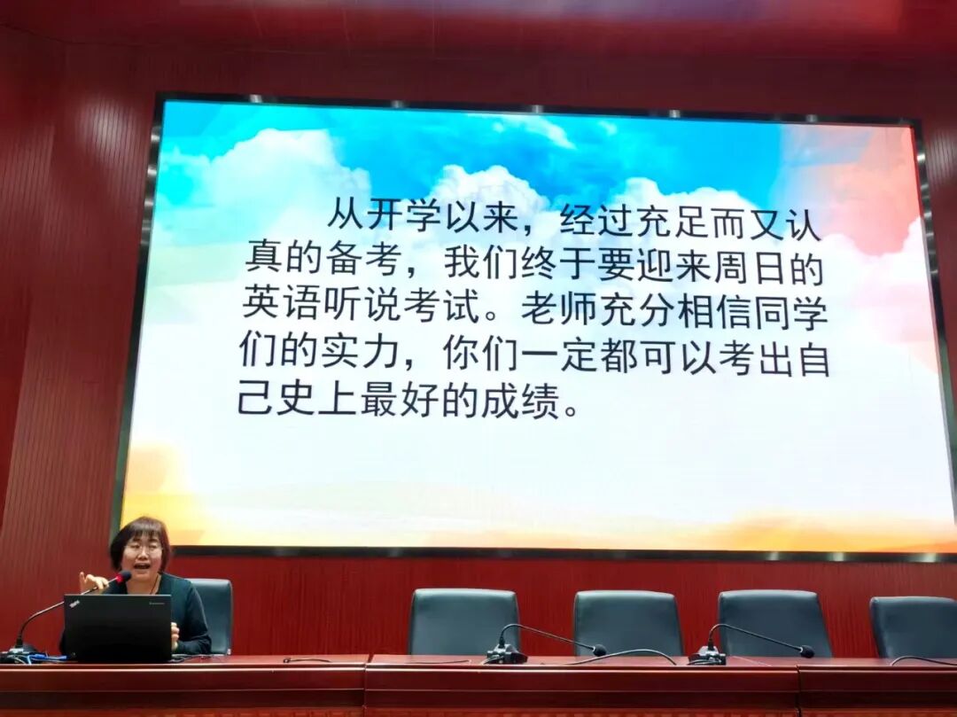 初三英语备课组长朱瑞兵老师为听说考试最后冲刺送上暖心寄语:自开学以来,英语教研组全体教师并肩奋战,以扎实的解题技巧、实用的应试策略为同学们全力护航。朱老师鼓励大家保持冷静清醒,放平心态从容应考,以最佳状态奔赴考场,定能旗开得胜、首战告捷!