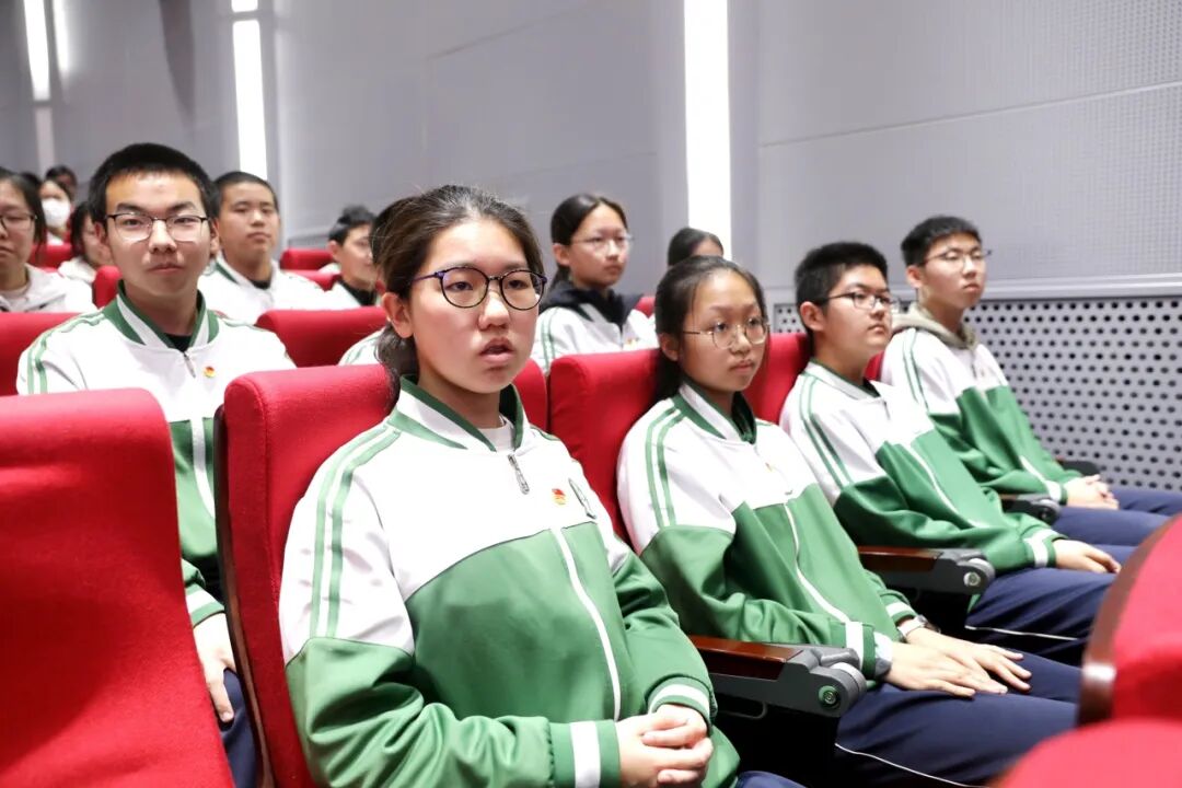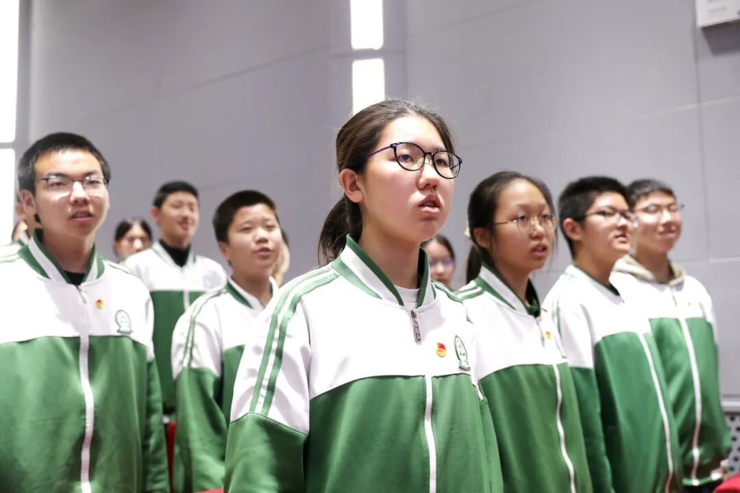 初三党支部书记陈祥彬老师在大会上率先带领全体同学回顾“一二·九”运动的历史意义,向所有新团员致以热烈祝贺,欢迎他们加入共青团这个温暖的大家庭,迈出了人生旅途中重要的一步。对于即将迎来的中考英语听口考试,陈老师鼓励大家带着团员的责任与担当奔赴考场:用先辈们的拼搏意志,专注听辨每一个细节;用青春的自信风采,流利表达每一个观点;用团结协作的精神,互相鼓劲、共同进步。把入团的荣誉感,化为考试的战斗力;把历史的传承力,变为冲刺的爆发力!