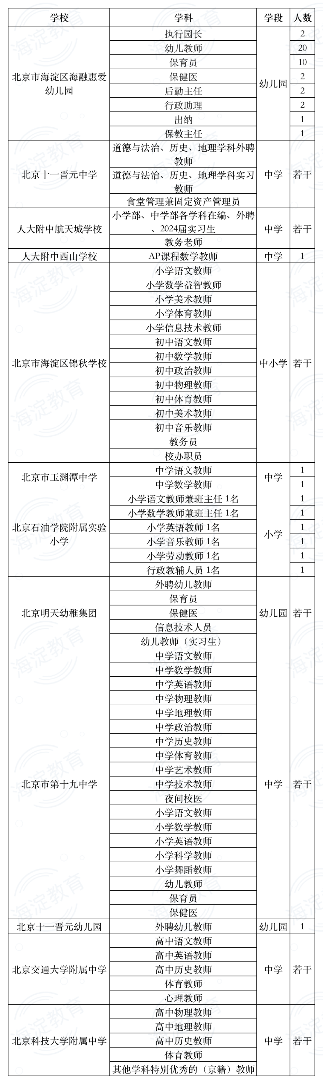 一校一宣、多岗直招 栏目是 “海淀教育人才”微信公众号的重要特色栏目,为应届大学毕业生、教师职业者、有意愿从事教育行业的社会人士服务,围绕海淀区教委所属的中小学、幼儿园和直属单位的岗位需求,公众号于工作日定期推出该学校信息,详细介绍学校发展情况,展示学校人文风采,培养学生知识素养,按照学校用人需求,给予联络方式和回馈信息。海淀教育微信公众平台将于每周五推送海淀教育人才提供的一周招聘信息,欢迎大家关注。