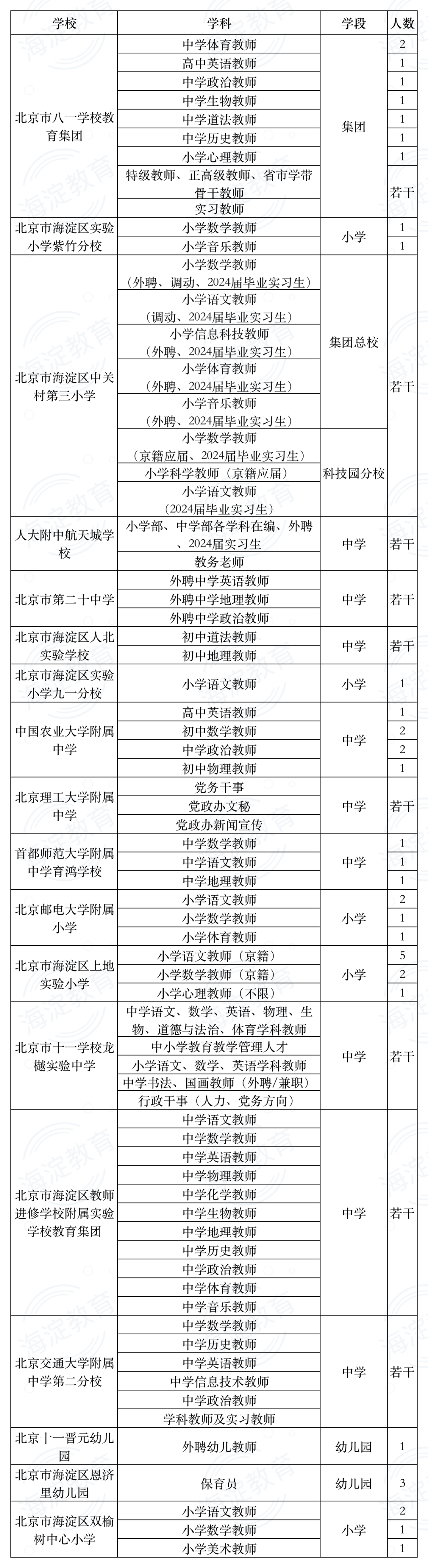 一校一宣、多岗直招 栏目是 “海淀教育人才”微信公众号的重要特色栏目,为应届大学毕业生、教师职业者、有意愿从事教育行业的社会人士服务,围绕海淀区教委所属的中小学、幼儿园和直属单位的岗位需求,公众号于工作日定期推出该学校信息,详细介绍学校发展情况,展示学校人文风采,培养学生知识素养,按照学校用人需求,给予联络方式和回馈信息。海淀教育微信公众平台将于每周周末推送海淀教育人才提供的一周招聘信息,欢迎大家关注。