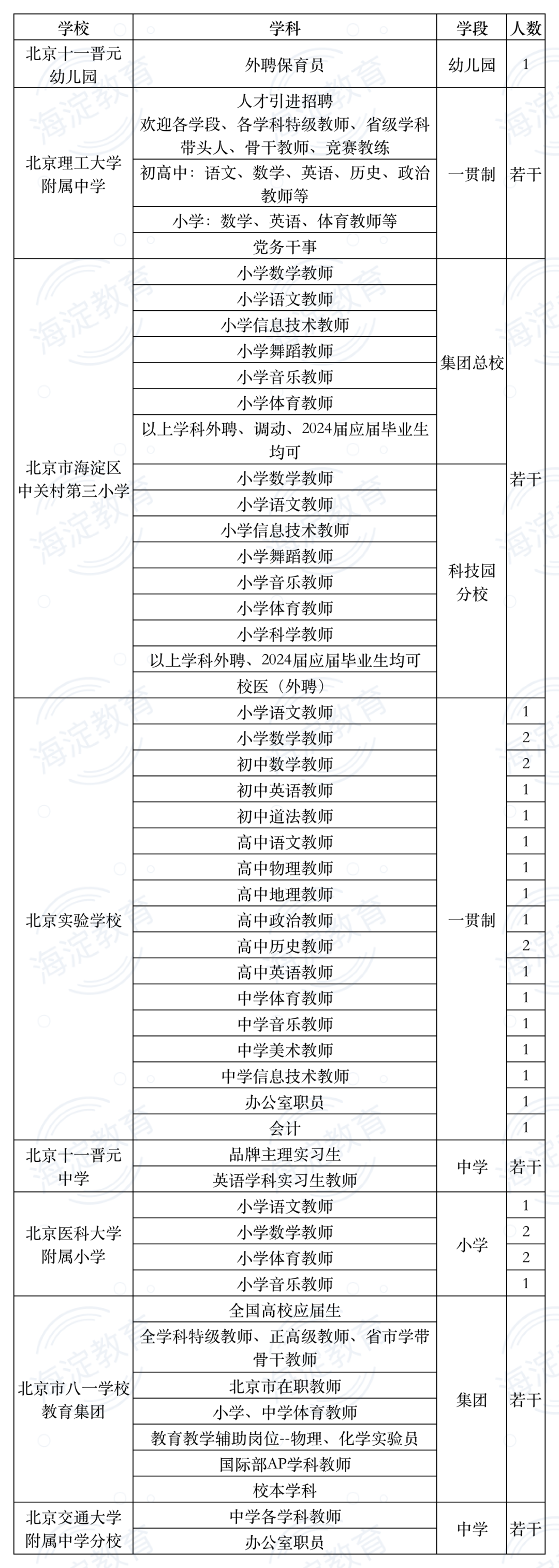 一校一宣、多岗直招 栏目是 “海淀教育人才”微信公众号的重要特色栏目,为应届大学毕业生、教师职业者、有意愿从事教育行业的社会人士服务,围绕海淀区教委所属的中小学、幼儿园和直属单位的岗位需求,公众号于工作日定期推出该学校信息,详细介绍学校发展情况,展示学校人文风采,培养学生知识素养,按照学校用人需求,给予联络方式和回馈信息。海淀教育微信公众平台将定期推送海淀教育人才提供的招聘信息,欢迎大家关注。
