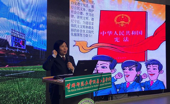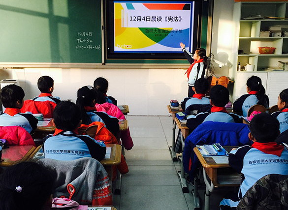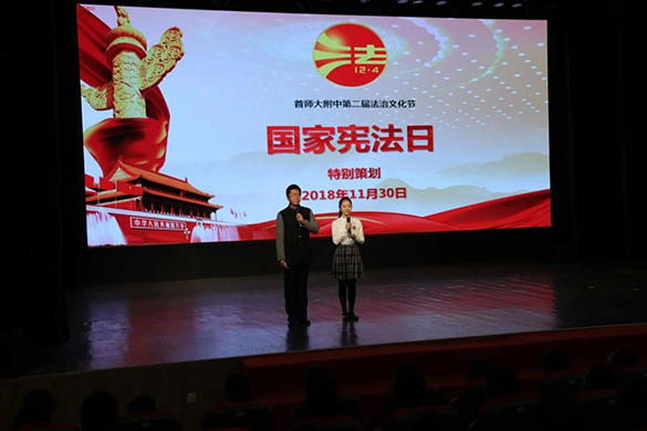 在教育部全国教育普法领导小组办公室在举行的“2018年国家宪法日教育系统宪法晨读活动”中,首师大附小的8名师生在活动主会场和全国青少年一起唱响宪法主题曲《宪法伴我成长》。