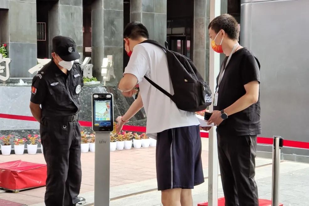 在学校大门口,学校配备了多名防疫专员,协助学生做好相关检测工作。考生入校需要经过体温检测、人脸识别等相关程序,确认一切正常后方可进入学校,步入考场。