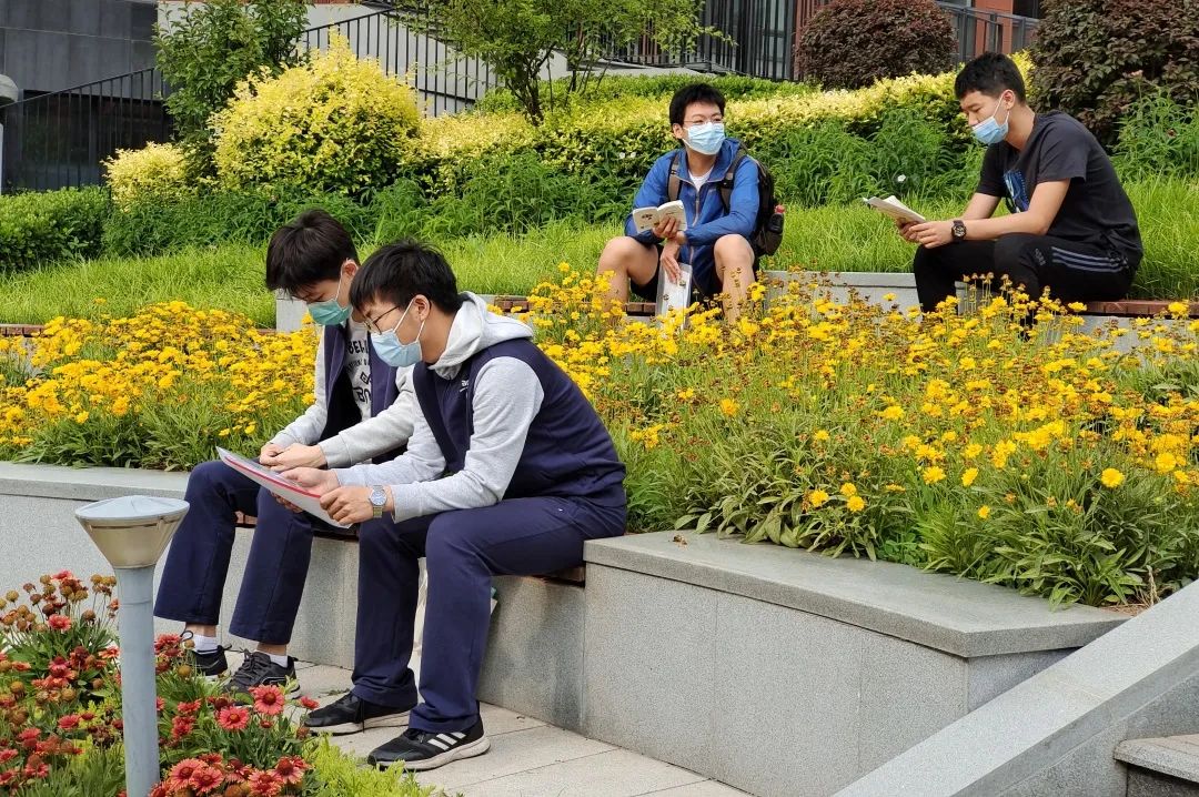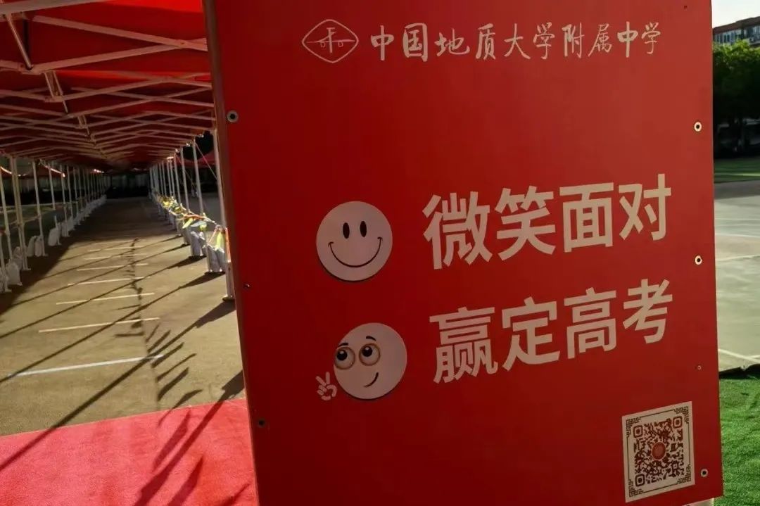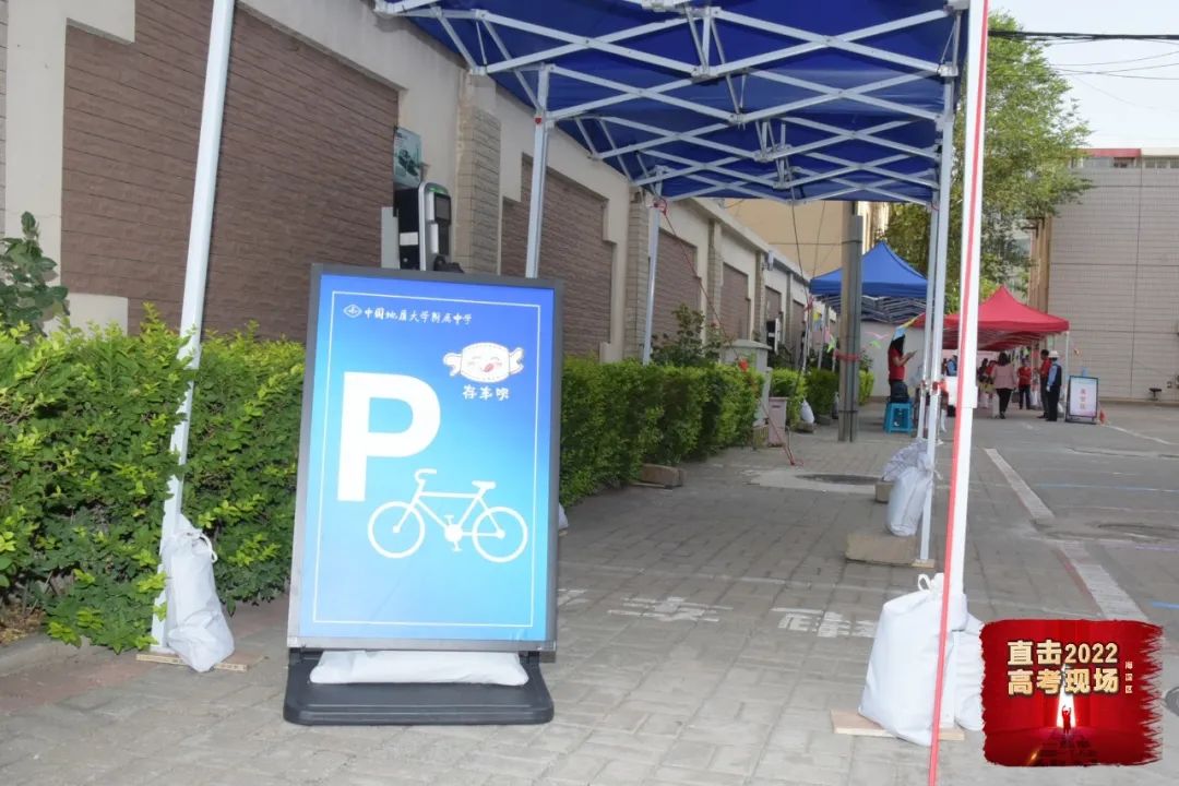 进入校园内,地大附中也设计了各种温暖而有趣的小提示,为考生做好服务。带有卡通笑脸的“微笑面对 赢定高考”指示牌、被定义为“晴天候考区”的大操场,还有印着卡通口罩提示牌的自行车停放处,每个点位都精心准备,充满青春活力。