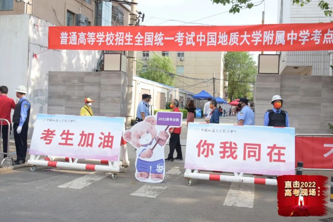 今年,地大附中作为新考点校,学校在各方面做足了准备。早上七点,考点入口处 “考生加油 你我同在”“学院路街道预祝各位考生金榜题名”等鼓励的话语为考生们送去温暖和鼓舞。两面红色刀旗迎风招展,上面写着“2022年高考考点”“中国地质大学附属中学”,迎接四面八方的考生。