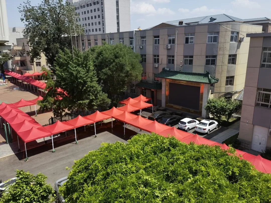 从考点入口到高中楼考场,地大附中搭建起了300多米长的红色防雨棚,寓意“鸿运当头”,为考生遮风挡雨、遮阳防晒。