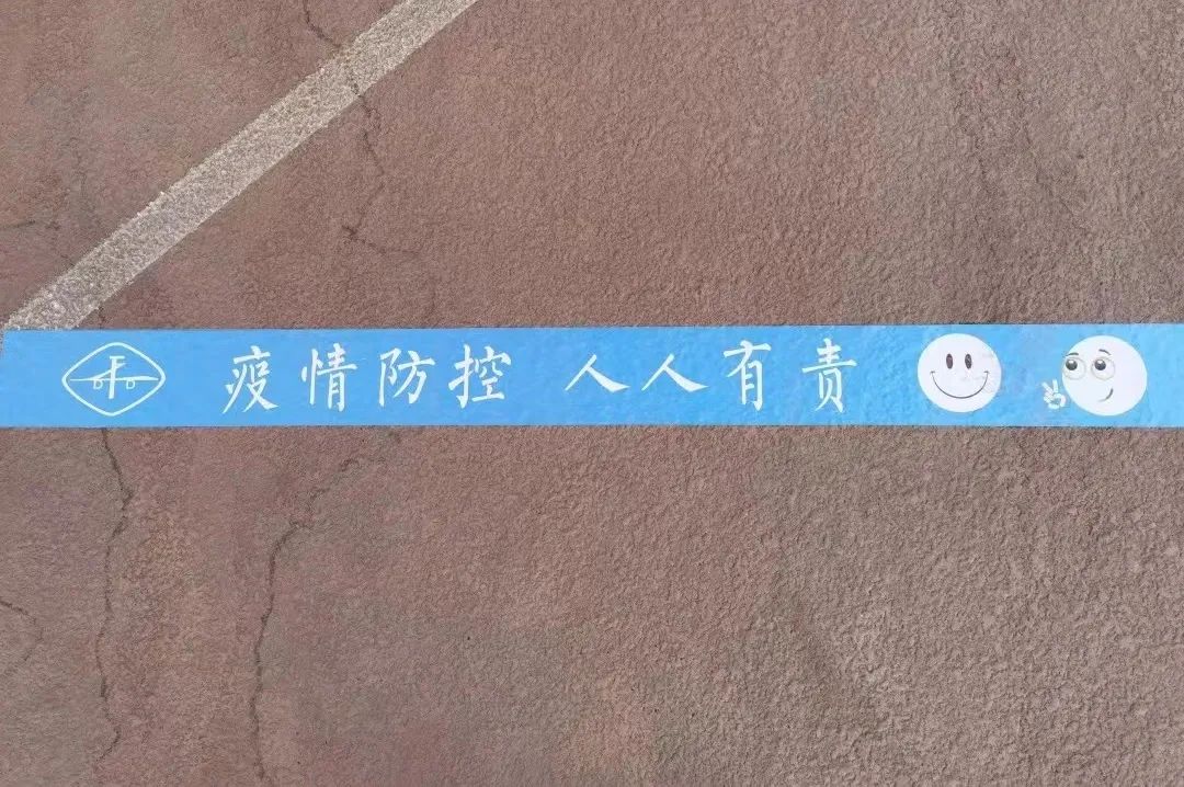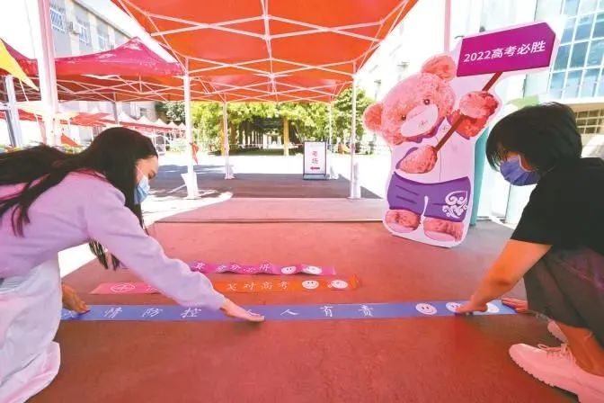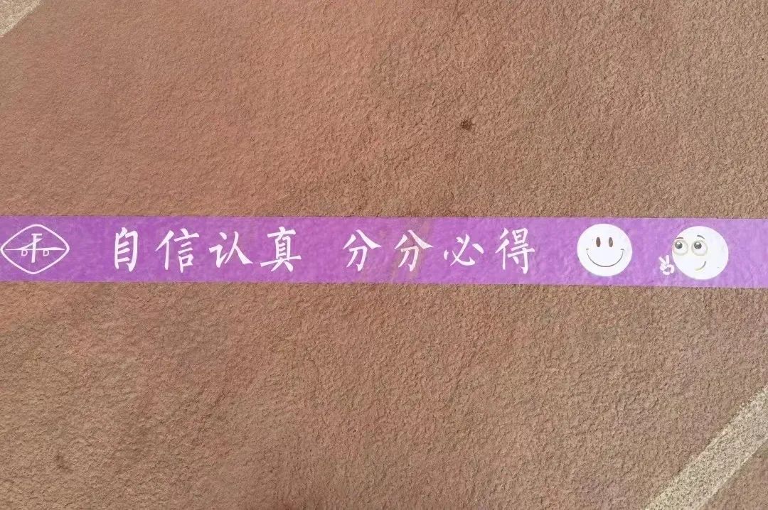 疫情期间学校的“两米线”也别出心裁,红色、蓝色、紫色的彩条交替出现,上面写着“沉着冷静 笑对高考”“疫情防控 人人有责”“自信认真 分分必得”,默默地鼓励着每一位走过的考生,为他们加油打气!