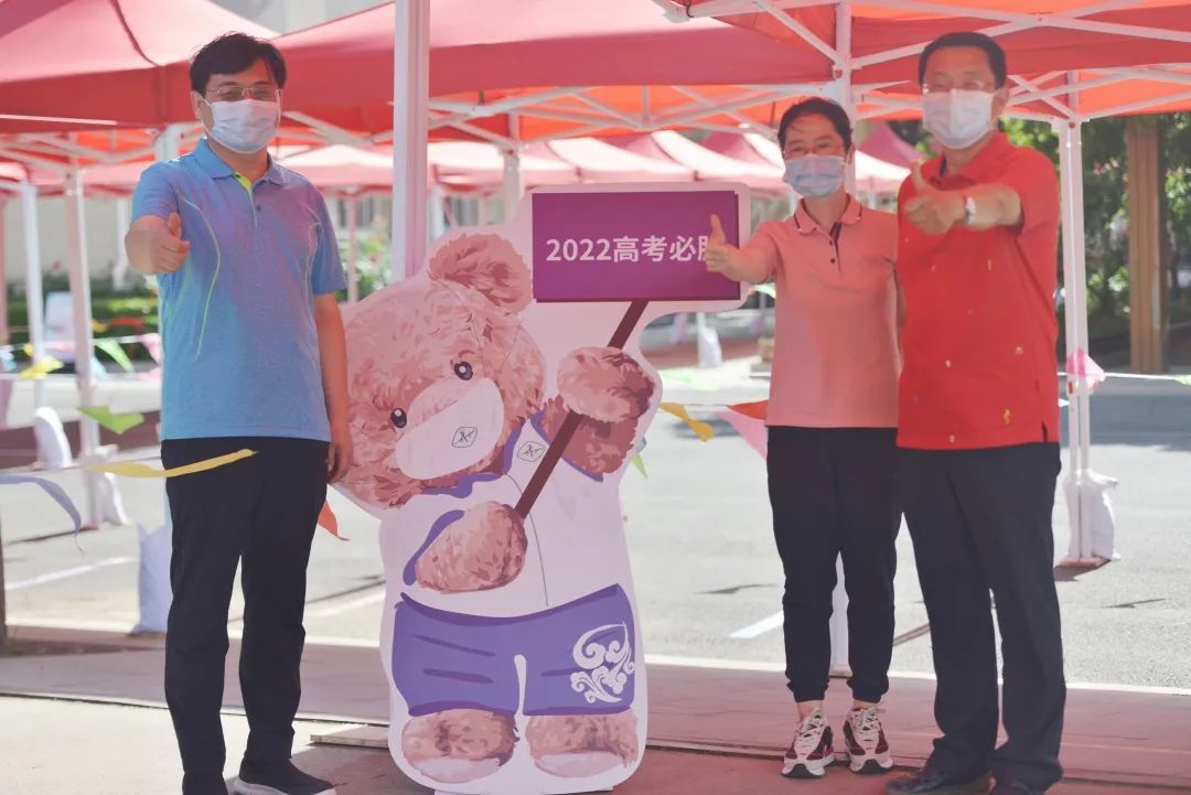 可爱的“校服熊”憨态可掬地站在门口——穿着校服,戴着印有校徽的口罩,举起“2022高考必胜”牌子,为考生们加油助威。不少考生看到后,都忍不住激动地搂着小熊合影,记录难忘的高考时光。