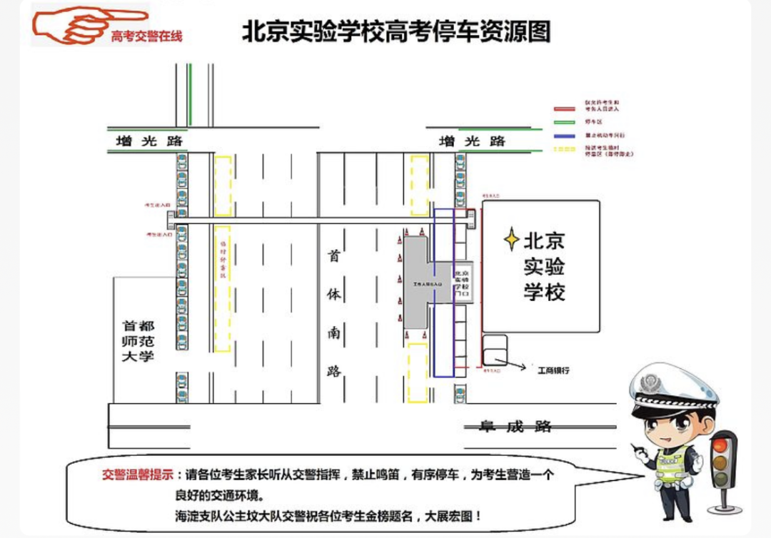 今年管界共有七个考点,北京实验学校(海淀)是其中之一。我们针对各考点校做了“一校一策”,每个学校都会有一个简易示意图、停车资源图。我们为7所学校开辟了7处临时停靠区,也提前对学校周边的交通标志、标线进行了复画,明确了一些指示标志。同时,我们及时跟学校对接,根据实际情况绘制了周围的路况图,还制作了一些临时停车证、停车二维码等,方便家长接送考生。