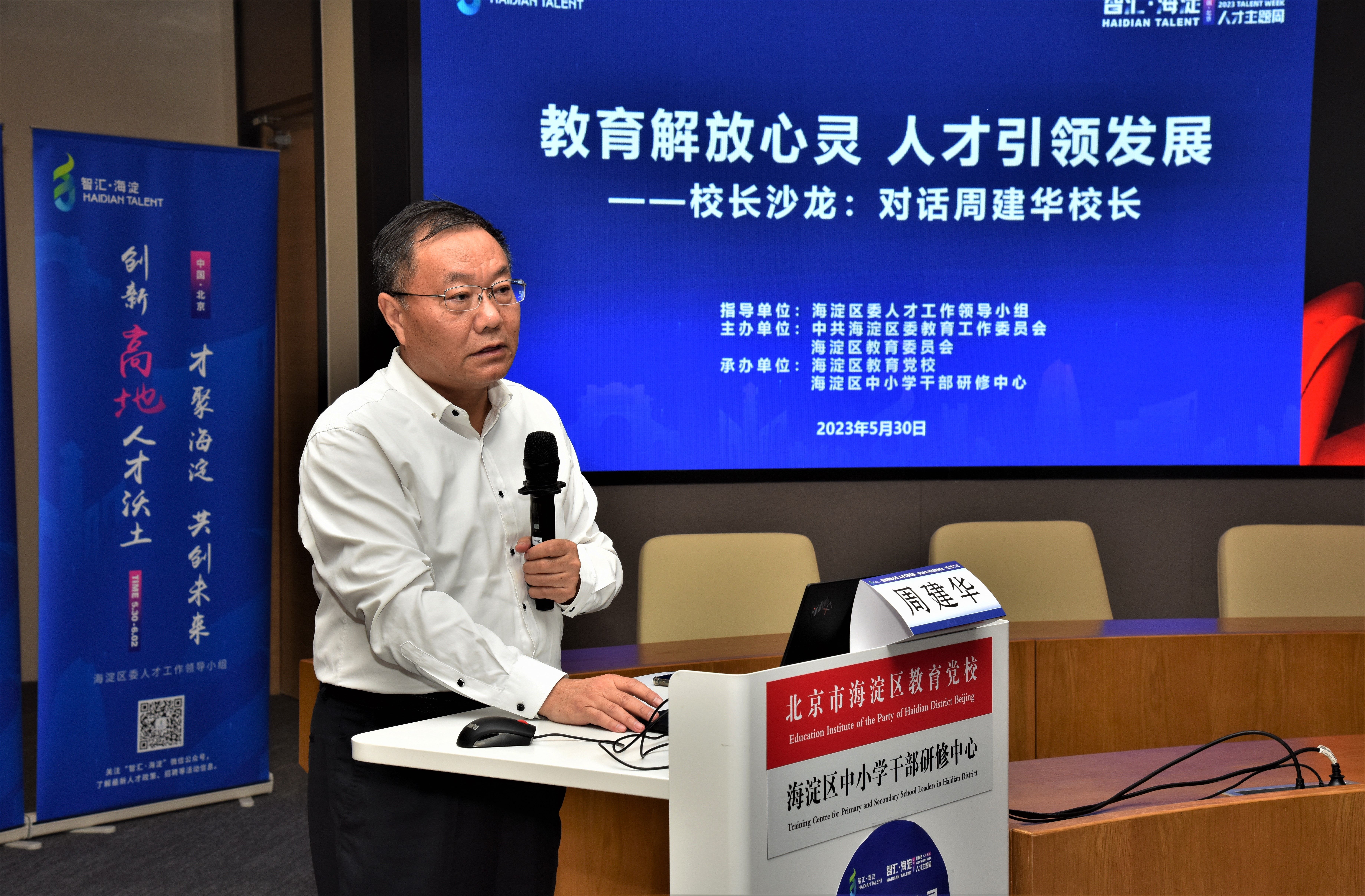 5月30 日“教育解放心灵 人才引领发展——对话周建华校长”主题校长沙龙活动在海淀区教育党校举行。活动邀请到人大附中航天城学校校长、人大附中联合学校总校常务副校长、创新人才教育研究会常务副会长周建华,北京师范大学教育管理学院院长苏君阳教授,与海淀区10余位书记校长面对面深度对话,共同探讨高端教育人才建设的路径规划与落地实施。海淀教育两委相关科室负责人、海淀教育智库专家、名校长工作室学员校长、部分2022年中青班学员、等共同参加了沙龙活动。