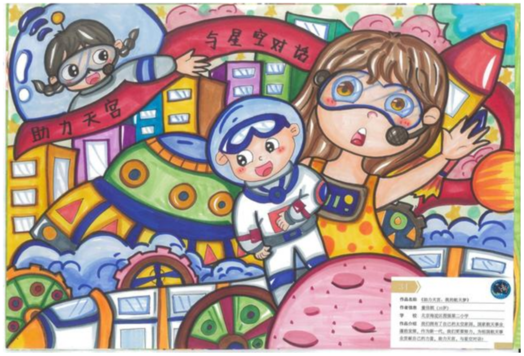 汇报过程中,黄学英展示了这样一幅绘画作品——2023年,在第二届“天宫画展”中国空间站展示的40幅绘画作品中,就有图强二小学生董佳妮的这幅作品《助力天宫,我的航天梦》。