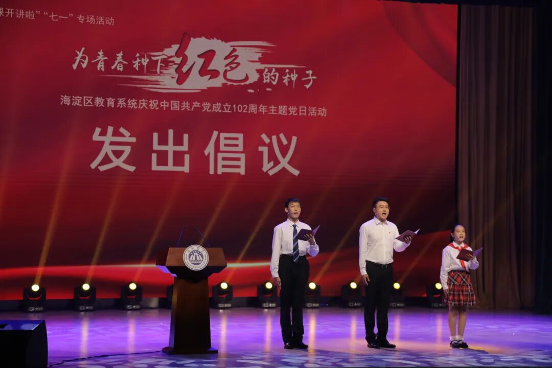 活动中,海淀区教育系统的中共党员、共青团员、少先队员代表发出“听党话、跟党走”的倡议,他们表示,共产党是先锋队,共青团是突击队,少先队是预备队,党团队一脉相承。我们要让红色教育在海淀扎根生长,让红色基因在海淀代代相传,行程万里,不忘初心,让我们用使命与担当共同续写海淀教育新辉煌。
