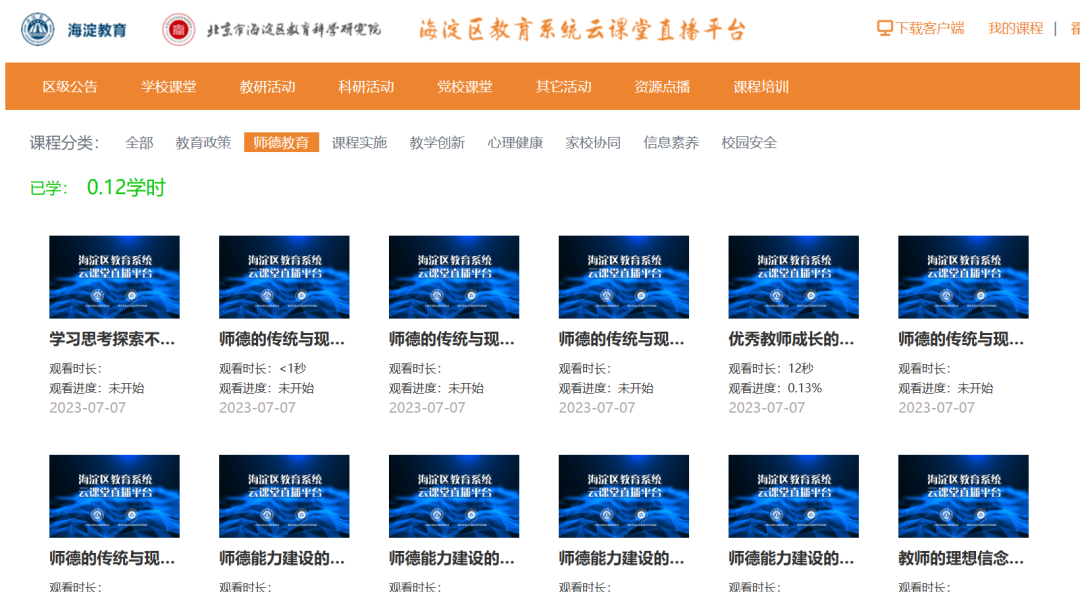 为了满足学校对实训内容的多元需求,海淀区教科院牵头建立课程资源库,对原有的海淀区教育系统云课堂直播平台进行功能开发,调整页面和栏目设置,由教育两委相关科室和教科院各部门提供了几十套精品课程,覆盖教育政策、师德教育、课程建设、教学创新、心理健康、家校协同、信息素养和校园安全等八大模块,供学校自主选择使用。