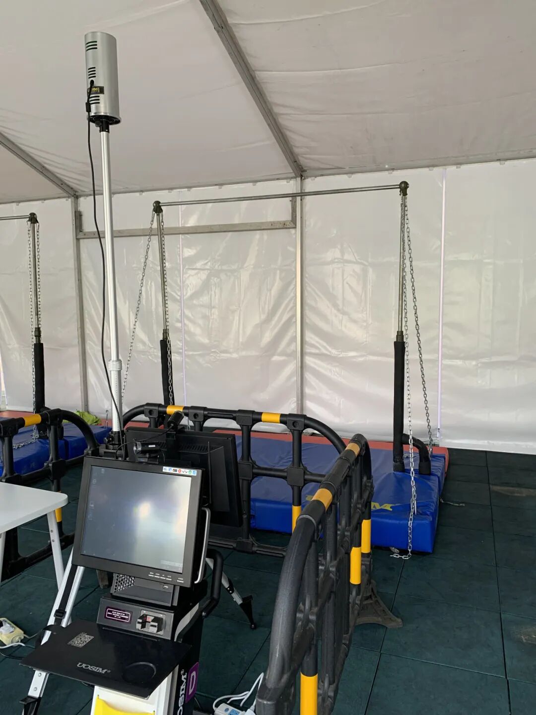 双脚踩在指定区域,身体保持直立,平视前方。