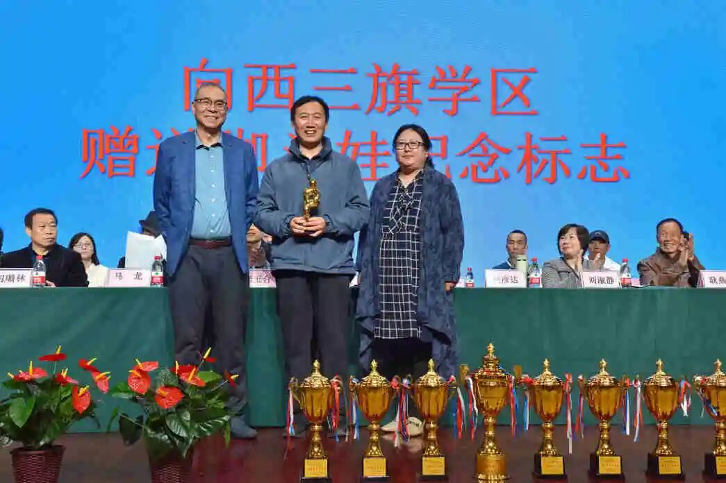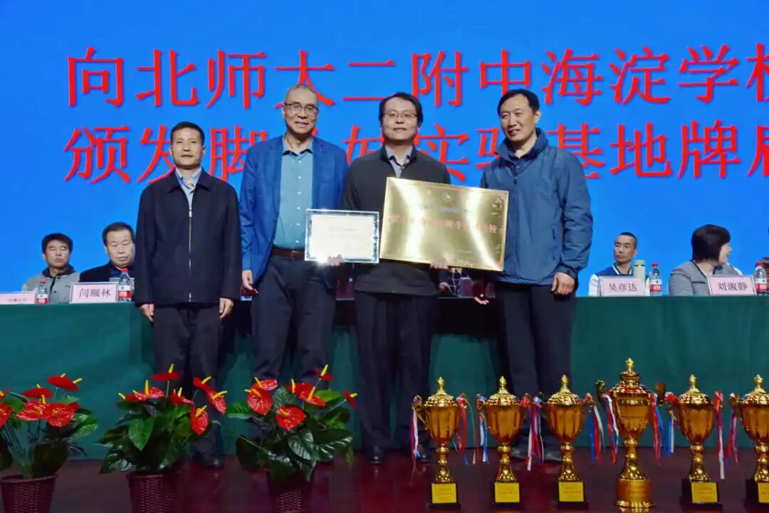 与会领导向西三旗学区赠送脚斗娃纪念标志。北师大二附中海淀学校获颁脚斗娃实验基地校。