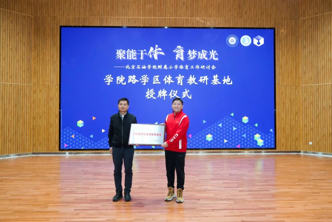 学院路学区委员会主任委员王进为石油附小颁发学院路学区体育教研基地牌。
