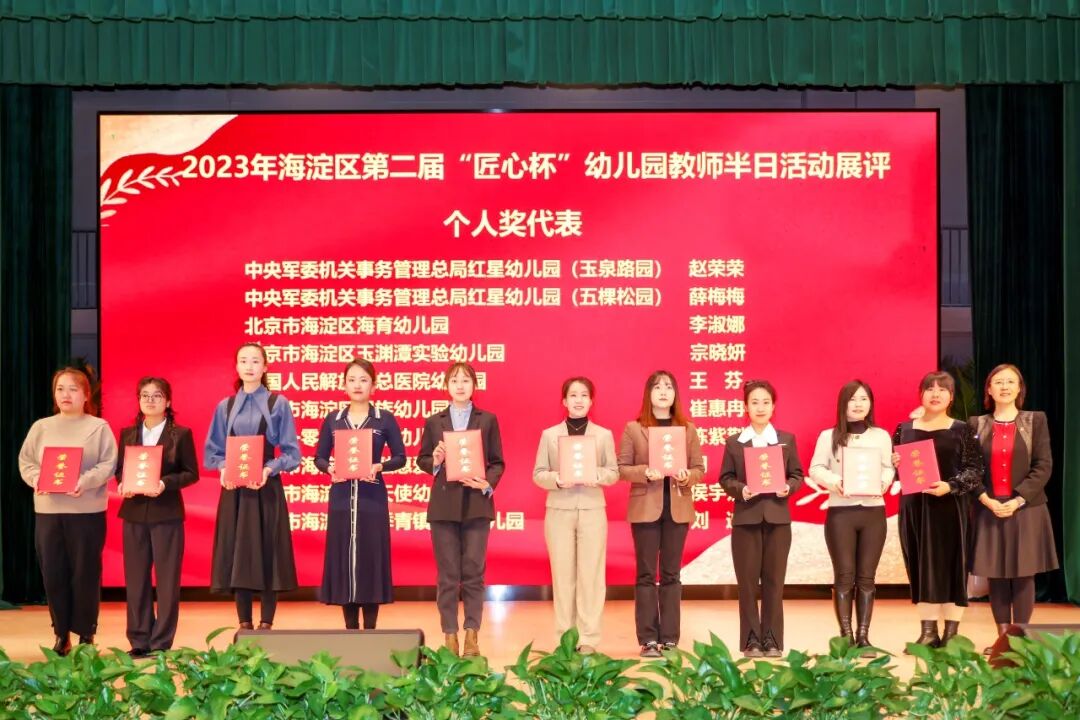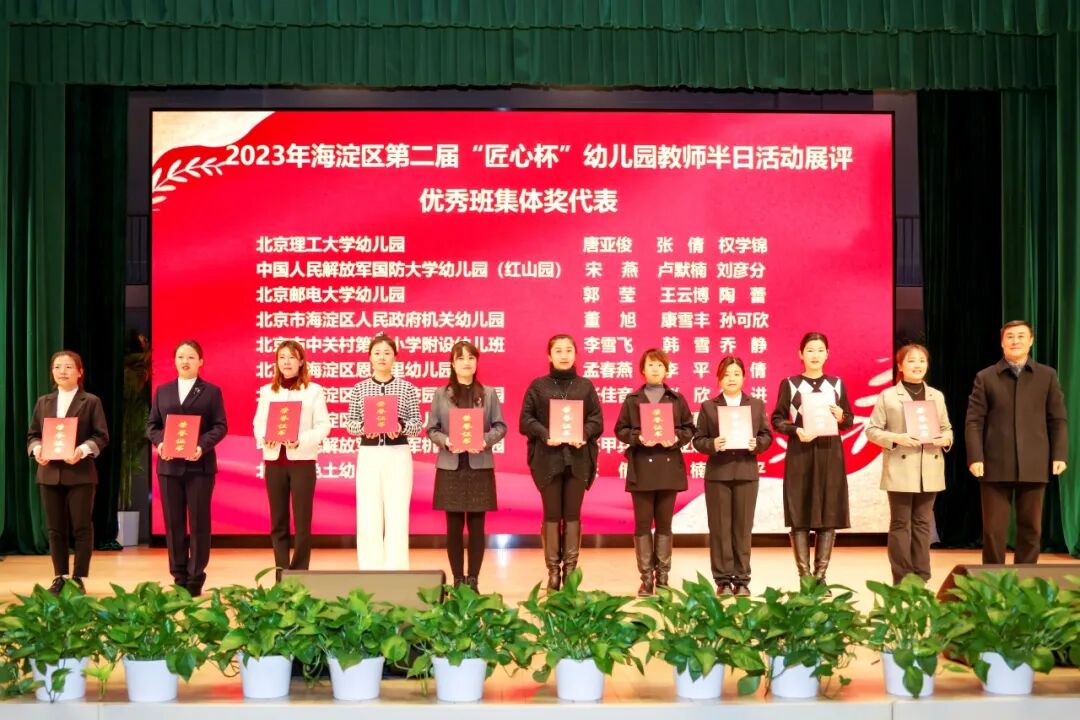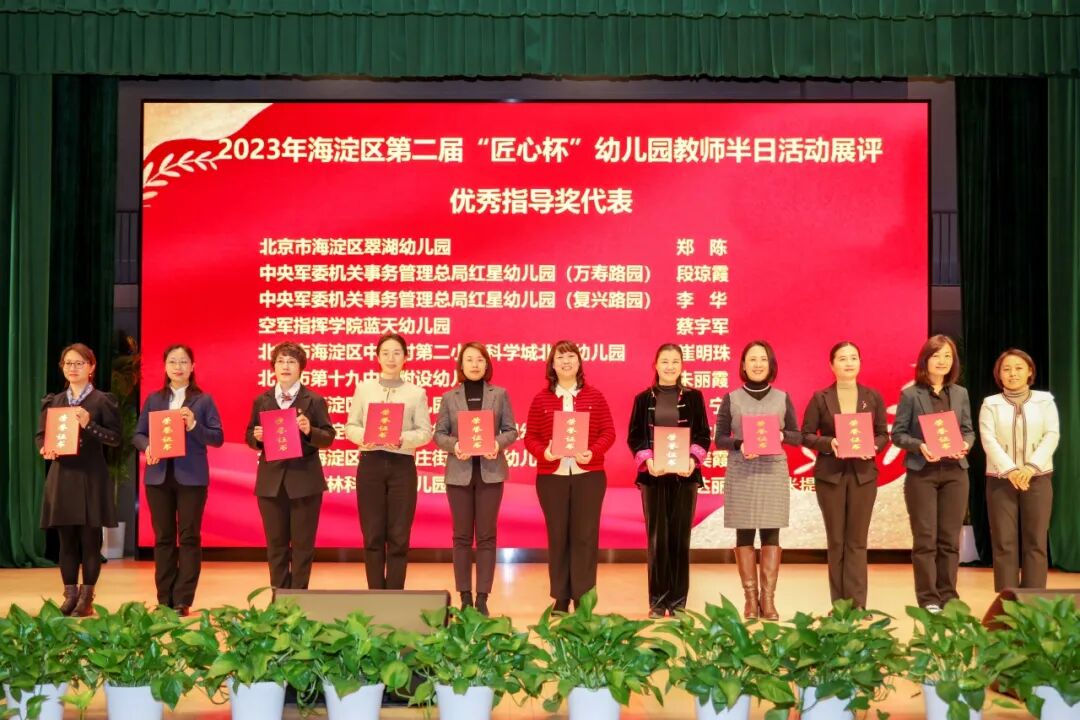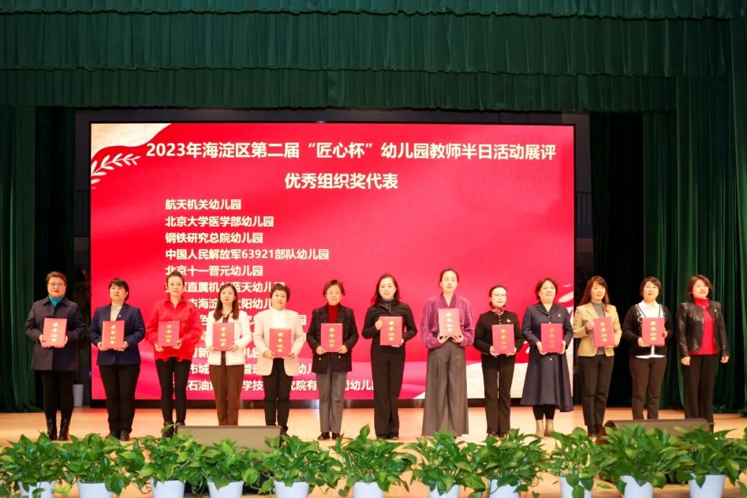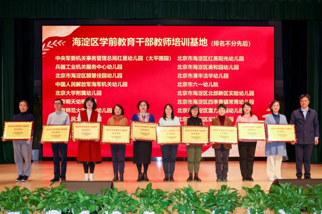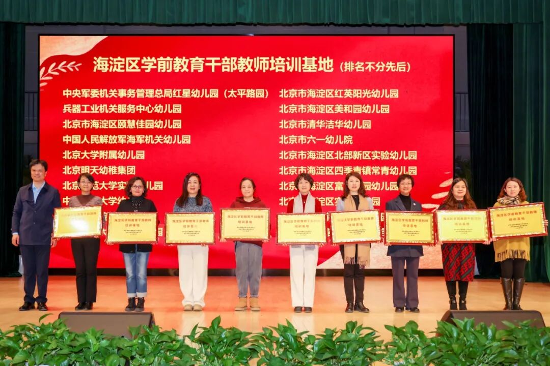 与会领导为20个“海淀区学前教育干部教师培训基地”颁牌,为海淀区第二届“匠心杯”幼儿园教师半日活动展评获奖组织及个人代表颁奖。