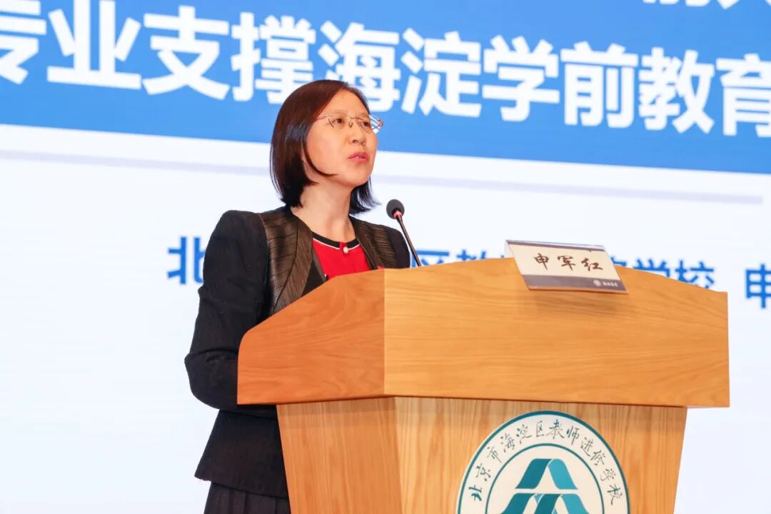 会上,海淀区教师进修学校党委书记申军红以《深耕全覆盖学前大教研 专业支撑海淀学前教育质量提升》为主题,介绍了学前教育教研工作成果。