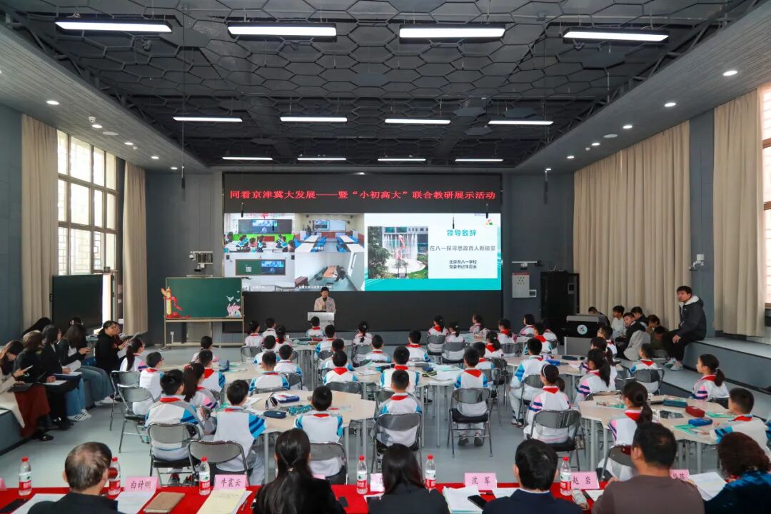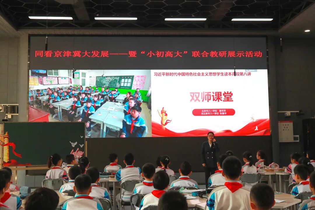 今年是京津冀协同发展战略实施十周年,也是习近平总书记在学校思想政治理论课教师座谈会上发表重要讲话五周年。3月15日,同看京津冀大发展——暨“小初高大”思政课集体研讨活动在北京市八一学校举行。来自京津冀三地“小初高大”四所学校的师生们围绕同一主题,共上一堂“大思政课”。天津大学马克思主义学院、海淀区大中小学思政课一体化共同体、八一教育红色联盟教育协作体、北京师范大学第三附属中学、河北省张家口第六中学、河北阜平八一学校、北京市八一学校共同参与。