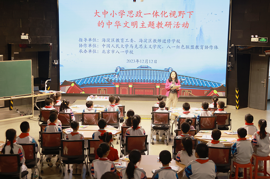 2023年12月,联合中国人民大学,召开思政课一体化现场展示课活动,首开大中小学段学生、教师同上一个主题的先河。