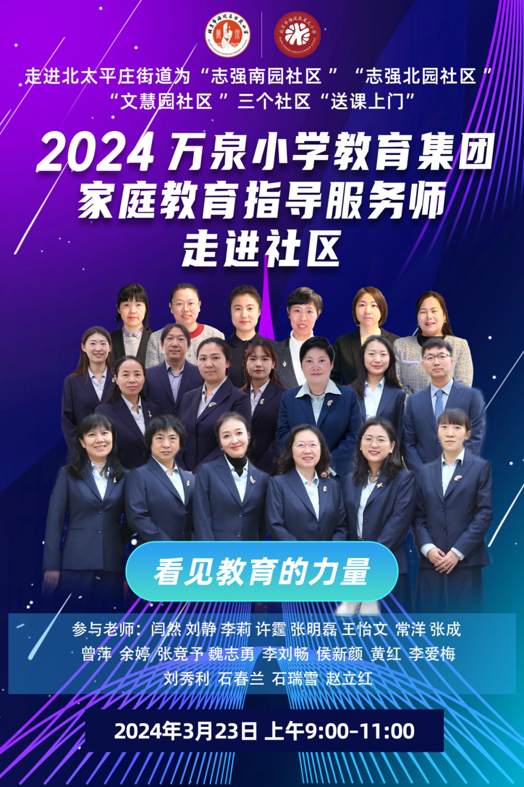 据悉,2022年9月27日,万泉小学举行了家庭教育指导师研修班启动仪式。万泉小学也由此成为《中华人民共和国家庭教育促进法》出台后,北京市首家开展“家庭教育指导师”培训的学校。截至目前,学校已经开展两次家庭教育指导服务进社区活动,进一步加强了家校间的沟通与交流,发挥校、家、社协同育人功效,以及学校在家庭教育指导中的积极作用,为学生和家长提供更多关爱、帮助和指导。