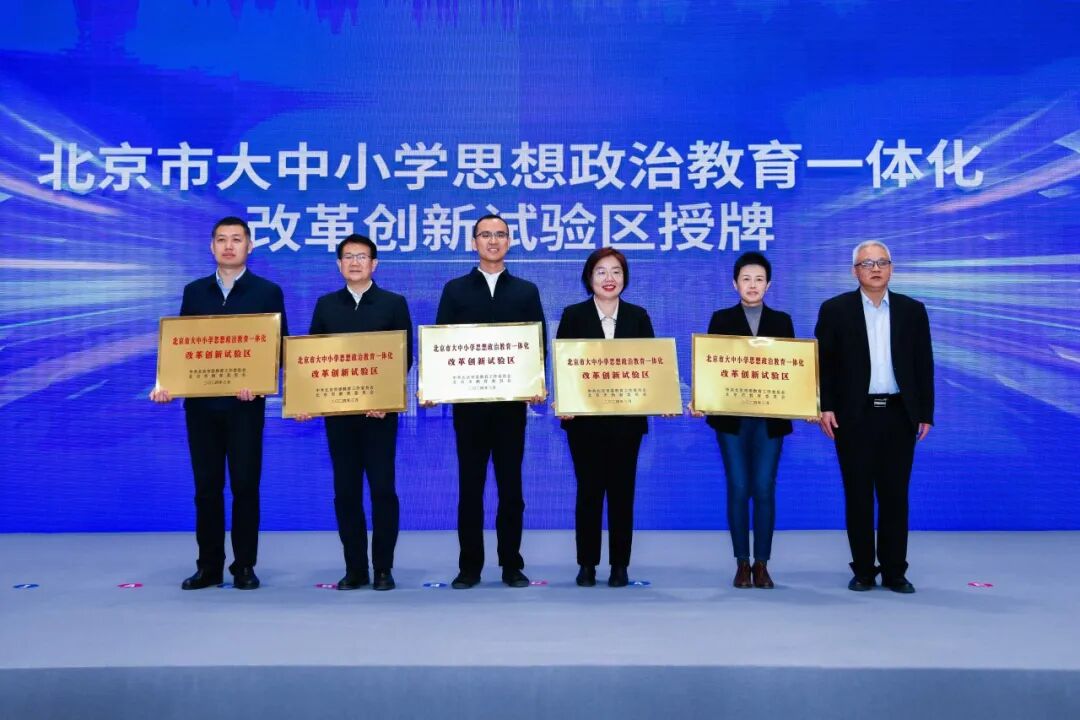 为切实发挥各区在大中小思政一体化建设中的组织推动作用,市教育两委在西城区、朝阳区、海淀区、通州区、怀柔区设立首批大中小学思想政治教育一体化改革创新试验区,作为大中小学思政课、心理健康教育、学科育人、网络育人和实践育人一体化的试点单位。会上,西城区副区长李健希,朝阳区副区长杨蓓蓓,海淀区副区长武凯,通州区委常委、宣传部长侯健美,怀柔区副区长于家明接受了试验区颁牌。