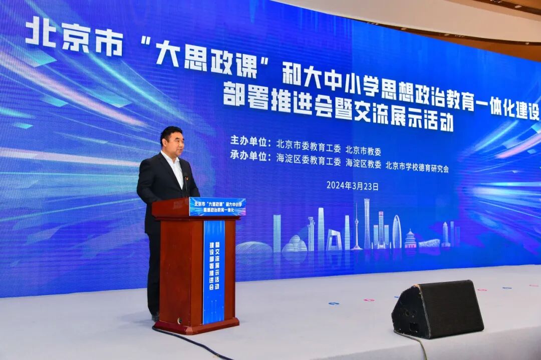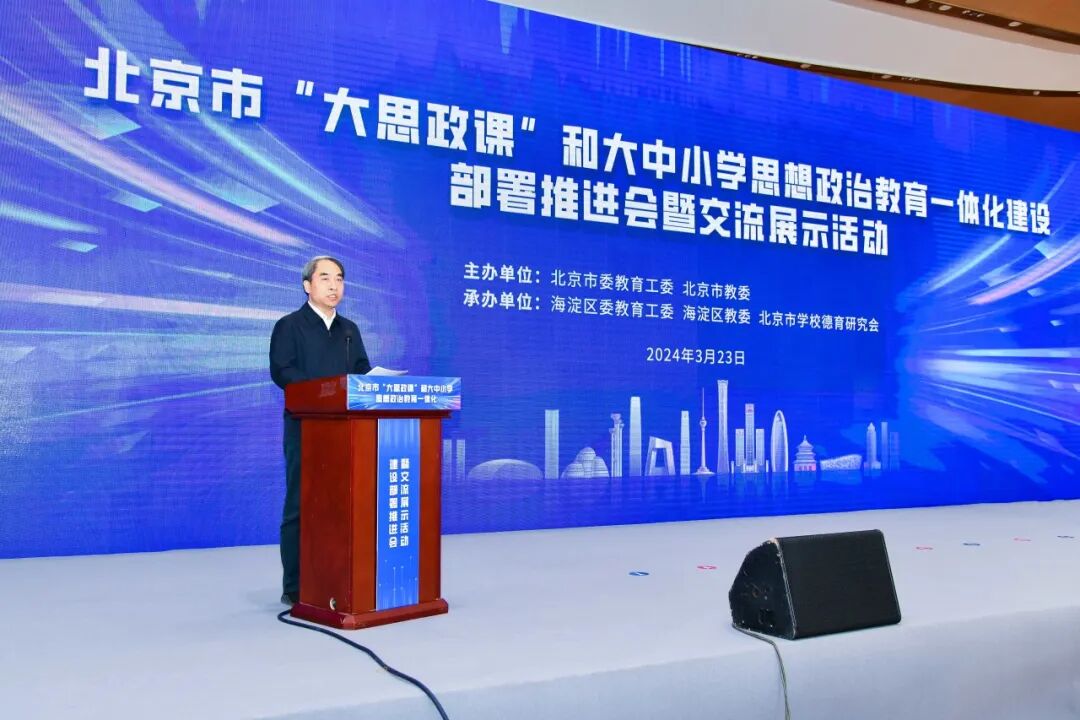 3月23日,北京市“大思政课”和大中小学思想政治教育一体化建设部署推进会暨交流展示活动召开。会议旨在深入学习贯彻习近平总书记关于教育的重要论述,全面落实教育部部署安排,以首善标准推进“大思政课”和大中小学思想政治教育一体化建设落地落实,为构建学校思政工作新生态“破题”,为探索教育新质生产力“求解”,为服务教育强国建设“聚力”。