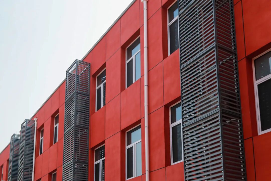 教学楼主色调延续红白相间,楼体为砖红色,窗框为白色,和南校区保持一致。教学楼共三层楼,下面两层为一二年级教室,三层为专业教室和录课教室等。每层颜色我们都进行了精心的考量和设计,分别为粉色、蓝色和绿色。