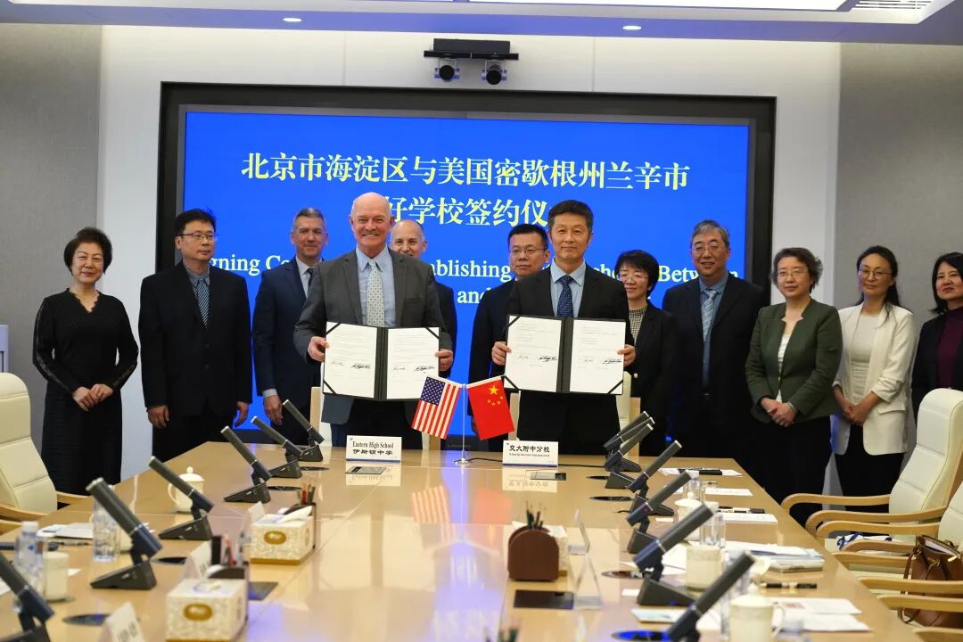 随后,在双方领导的共同见证下,海淀区交大附中分校、清华附中上地小学与兰辛市伊斯顿中学、波斯特奥克小学分别签署了友好学校协议,标志着两地教育资源合作共享迈入了新阶段。