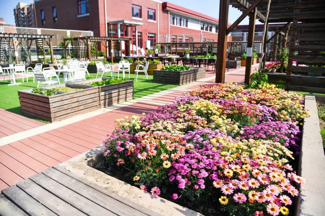 如果不是亲眼看到,会很难相信一座教学楼的屋顶可以种植如此多种类的鲜花。荷花、雏菊、芍药、双色茉莉等十余种花卉分布在各处花箱中,还有各色蔬菜在午后的阳光中茁壮地生长着。这是学校自2021年开始建设的元气活源农场,获评了“学生最喜爱的公共区域”第一名。