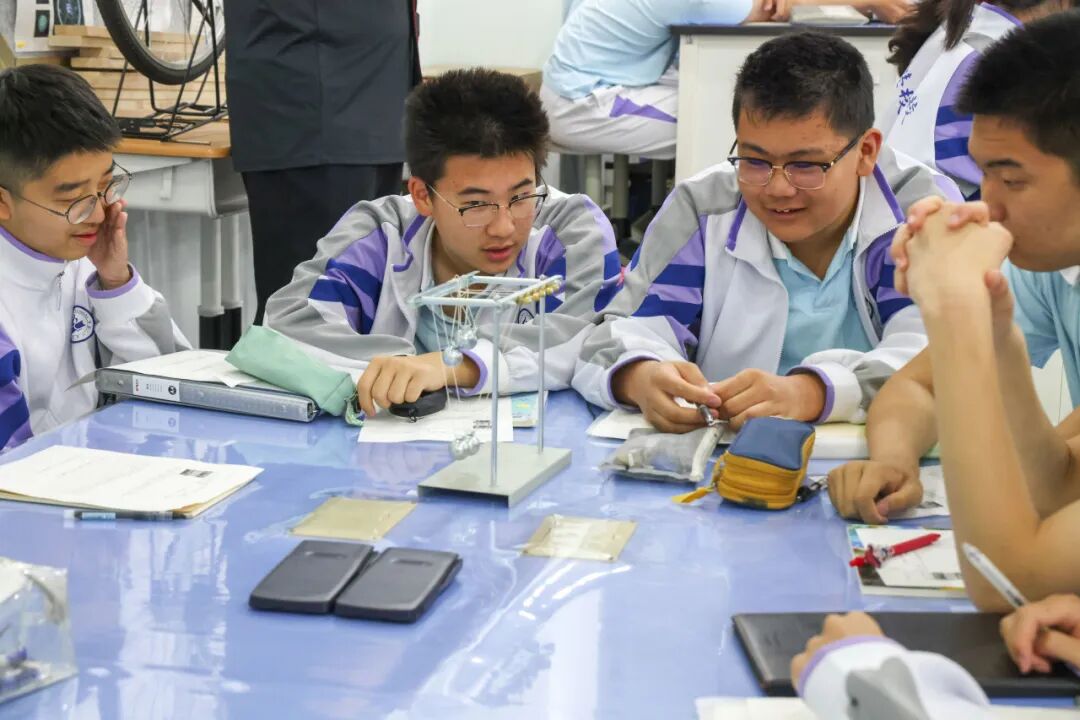 随后,调研组观摩了一节高一物理课,并参观了学校的专业教室、科学教育环境及硬件设施。观摩课上,老师通过小球碰撞实验,引导同学们观察现象,分析动量守恒定律及动量转移规律。调研组专家对老师的教学过程进行了认真的记录。