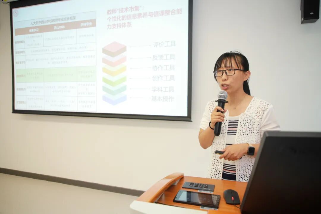 为促进成果转化与互学互鉴,培训会上,6位集团教师培训分责人和6位中小学学科教师,分别聚焦“人工智能助推学校教师专业发展”和“人工智能赋能课堂教学提质增效”主题,分享了智能教学创新实践案例,包括人工智能助力集团联研、校本研修、精准教学,生成式人工智能赋能学科教学实践、跨学科教学、双师课堂等内容,提供了人工智能与教育教学融合的生动经验与丰富策略。