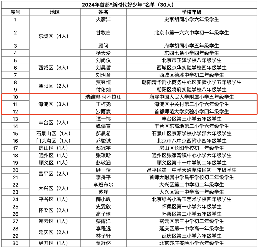 近日,首都精神文明建设委员会办公室公布了2024年首都“新时代好少年”名单。经学生自荐、同学互荐,以及老师、家长和社会推荐,海淀区3名学子成功入选。