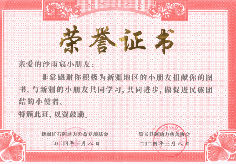 她还是个热爱公益,促进民族团结的小使者。沙雨宸出生于全国文明家庭和两代全国最美家庭,在良好家风浸润下,主动与新疆家庭结对帮扶,坚持为新疆小朋友赠送图书。常年坚持给独居老人送饺子,帮老人做家务;践行绿色环保,参加“垃圾分类家行动”。