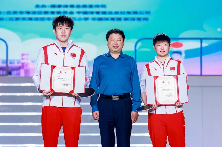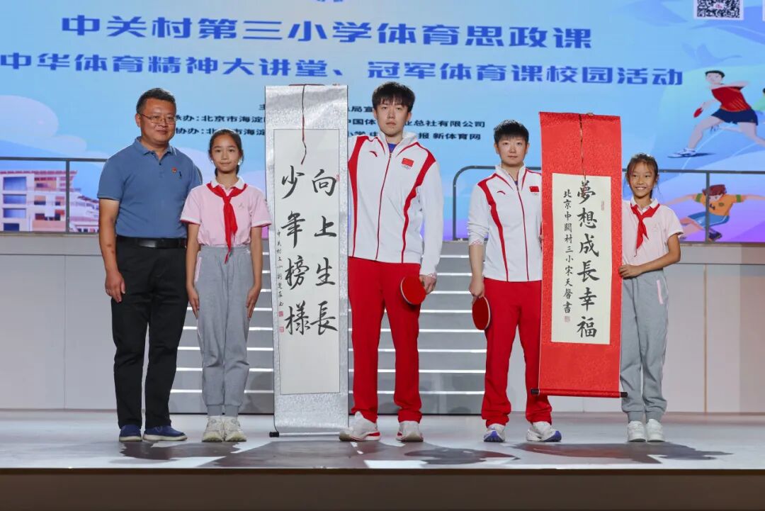 表演结束后,同学们为两位冠军分别献上自己亲笔书写的卷轴。杜荣贞为王楚钦、孙颖莎颁发“健康指导校长”聘任证书。