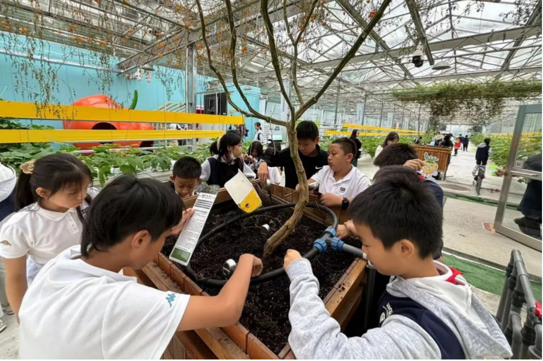 同学们在朝来农艺园的智慧农场探索之旅中,体验了无土栽培、灌溉水循环和温室小气候管理等现代农业技术。在温室环境下,同学们系统学习了无土栽培的技术和相应的装置,了解了无土栽培的三大优势:节水、减少土壤侵蚀、产量高。他们还掌握了用园艺探测器测量土壤质量的方法,并现场进行了土壤质量测量。