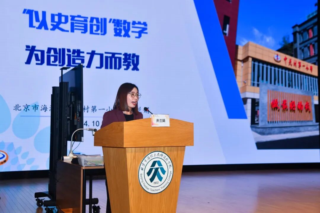 在主旨报告中,井兰娟从“以史育创”为何、何为、如何为、展望等方面,分享了对数学教育的思考和探索。她结合已有的研究基础尝试提出“以史育创”的数学教学观点,在开展教学实践中,以史为鉴,充分挖掘和利用数学史和数学文化学习资源,应用“问题引领创新”项目中的创新者自画像和问题锦囊的思维工具,通过开展数学阅读,了解数学家的创新成就;设计学科实践活动,体验创新实践;对话历史,感受创新智慧;拓展思维,进行个性化研究等实践路径,落实学生的创新素养的培养,让孩子们在愉快的数学学习中感受数学之美。