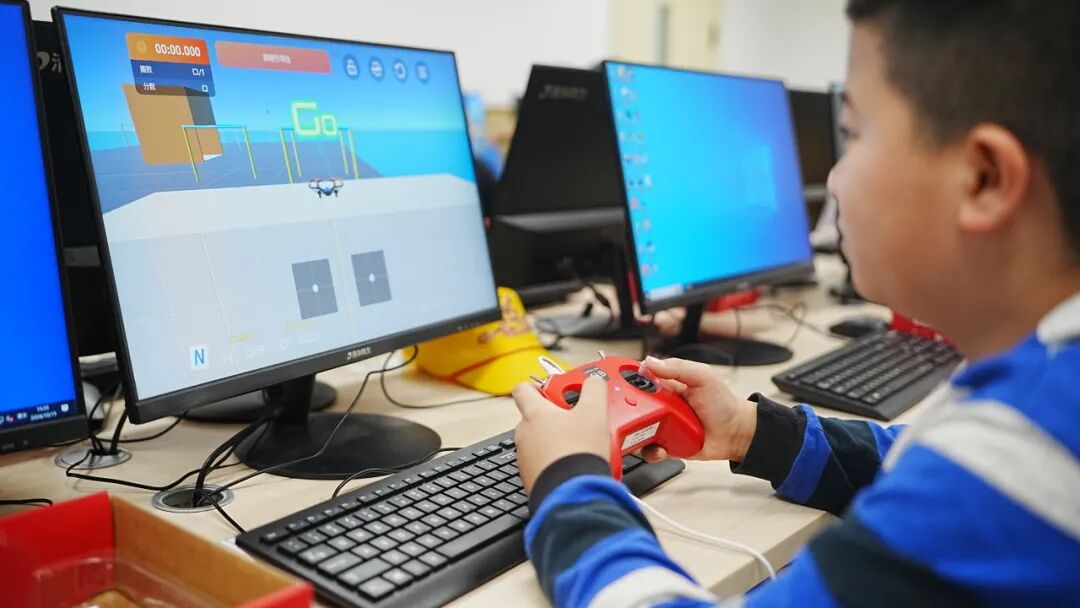 这是学校本学期开设的“无人机课”,学生们正在机房内进行实训练习。