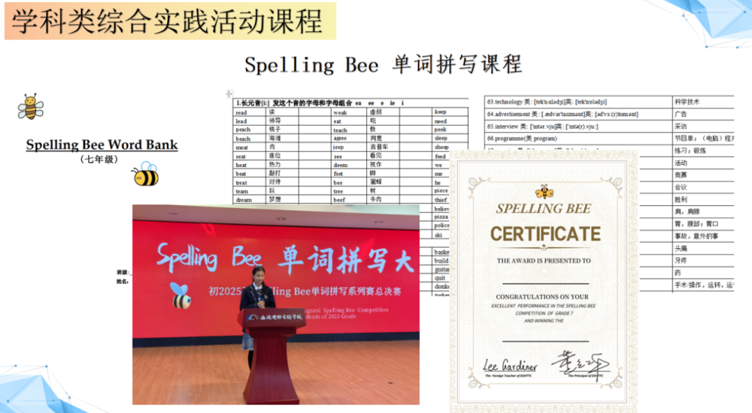 设计并实施了一系列丰富多彩的学科类、专题类和综合实践活动课程,如Spelling Bee单词拼写大赛、内蒙研学课程等,有效激发了学生兴趣,提升了学生综合素质。在英语教学中,通过创新教学方法,如使用单元思维导图、改错本等工具,显著提高了学生的学习效率和成绩。