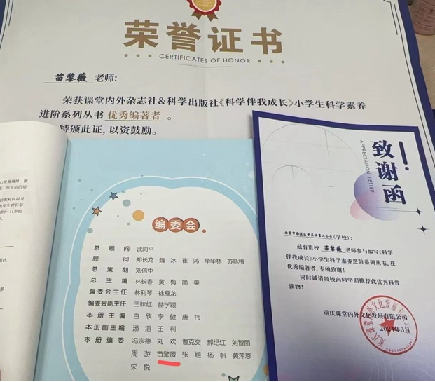 作为编委之一参与撰写图书《科学伴我成长》。负责的金鹏团经纬社始终发挥社团建设“领航者”作用,辐射带动兄弟学校社团建设等方面的发展。