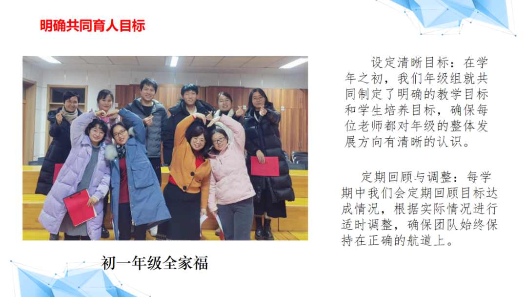作为初一年级组长,明确共同育人目标,凝聚团队力量,形成了全员育人的良好氛围。通过家长会等形式加强与家长的沟通,形成家校共育的合力,得到了家长的高度认可和支持。