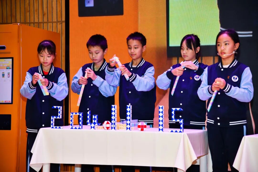 魔方在学生们的指尖灵动翻转,不一会儿便拼出“成为光”的字样,引发现场阵阵喝彩,啦啦操队与益智玩具秀冠军,带来了精彩的开场秀表演,在同学们的手中,汉诺塔快速翻转,可爱的图形在眨眼间完美呈现,速叠杯也仿佛有了生命,收叠速度之快、手法之奇妙,迅速点燃了全场气氛。