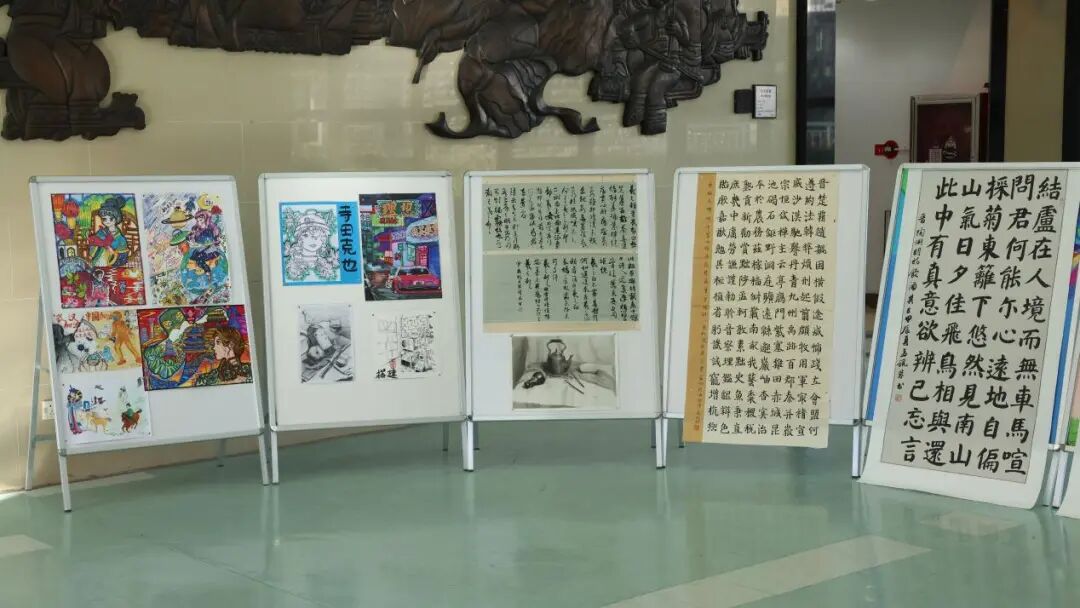 在静态展示区,学生们精心创作的书法墨宝与绘画佳作陈列其中。书法作品或刚劲有力,或飘逸灵动,笔画间蕴含着中华传统文化的深厚底蕴;绘画作品则题材广泛,有清新淡雅的山水画卷,有栩栩如生的素描画,还有充满奇思妙想的创意画作。色彩与线条在画布和宣纸上交织碰撞,展现出学生们丰富的内心世界和独特的艺术视角。