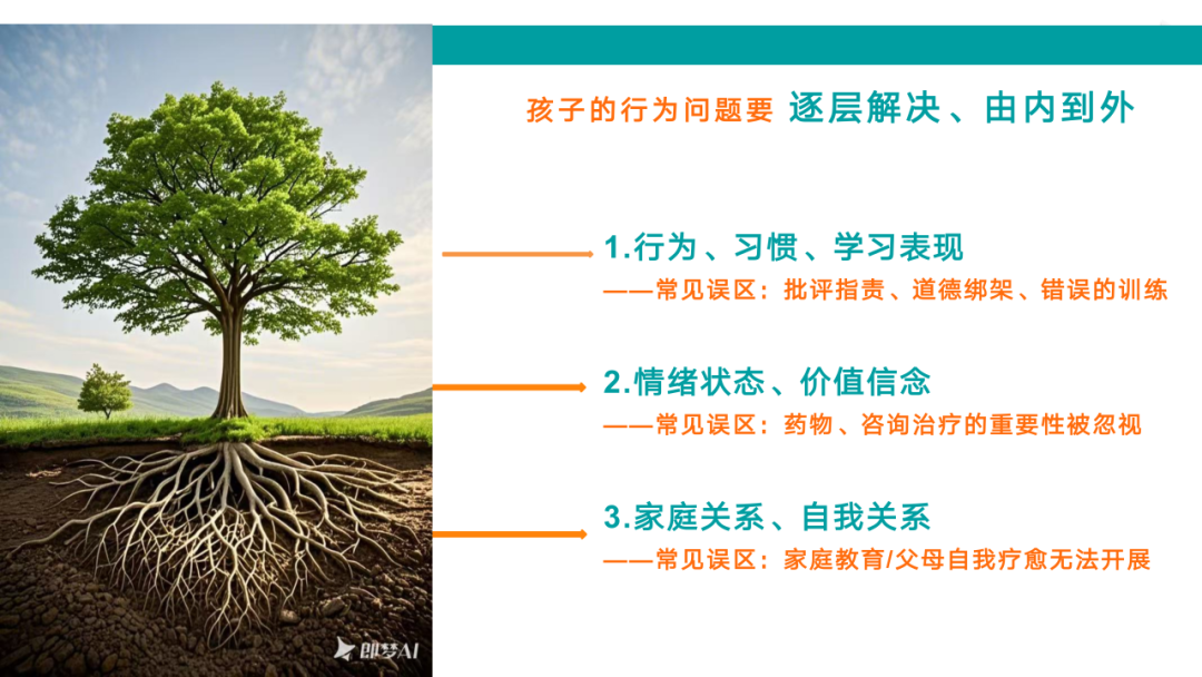 曹廷珲向家长们阐述了当下环境对孩子们的影响,指出遗传、互联网、人际冲突等因素激活并放大了孩子的情绪和欲望。在缺乏真实体验和锻炼,且身心发展不平衡的情况下,多样不可控因素很容易让孩子与父母缺乏沟通,甚至导致亲子间矛盾冲突频发。对此,曹廷珲倡导由内到外、逐层解决孩子的行为问题,多关注孩子的行为、习惯、学习表现,注意他们的情绪状态、价值信念,塑造健康的家庭关系、自我关系。